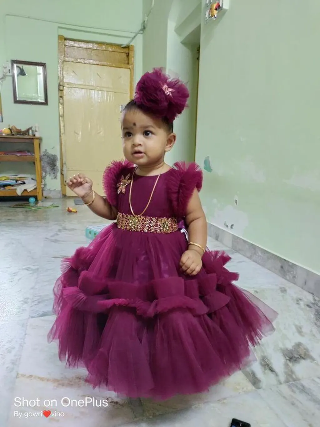 - Material : Grapevine shade mono nylon net with handwork on belt part. Neck is designed in pleated pattern with handworks on the belt part. Golden clutch stones, white & babypink beads with golden glass beads. Bottom portion of the frock is designed in a pleated pattern with ruffles just above the pleats. A matching handwork flower is attached on the one side yoke portion for more pretty look. Premium matching colour ultra satin is used as lining. Inner portion is covered with premium ultra satin and white cotton lining.
