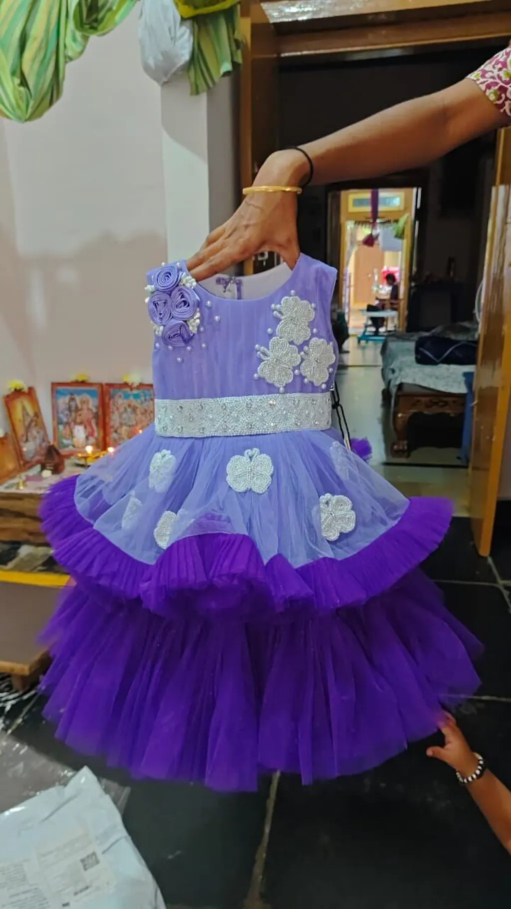 - Material: Lavender and Violet colour nylon net material is used in the upper portion and we are using Heavy quality ultra satin as the primary lining.This satin lining give the glossy feeling for the frock.In the yoke portion of the frock is stitched by pleating net and satin and give a Bunch of lavender cloth flower in the right side of the shoulder.