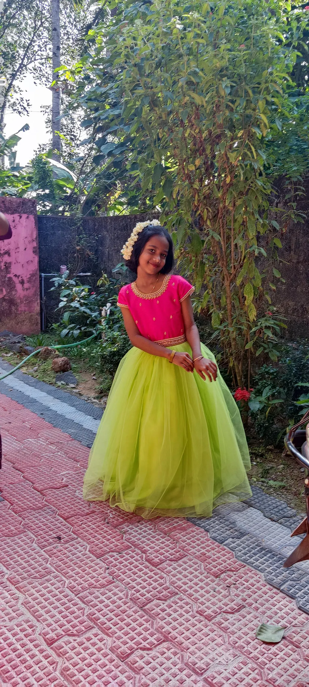 - Material: Lime Green shade mono nylon soft net fabric is used for the bottom of the skirt. Rany pink blended silk fabric with heavily embroidery handwork on the neck and center portion. A small cap sleeve is given for more classy feel Edges of the sleeves are highlighted with golden pearls and stones. Neck portion is designed round pattern. Premium quality ultra satin fabric is used inside as lining. The back side has matching silk tie for adjust the fitness. The inner portion is fully covered with white cotton fabric.