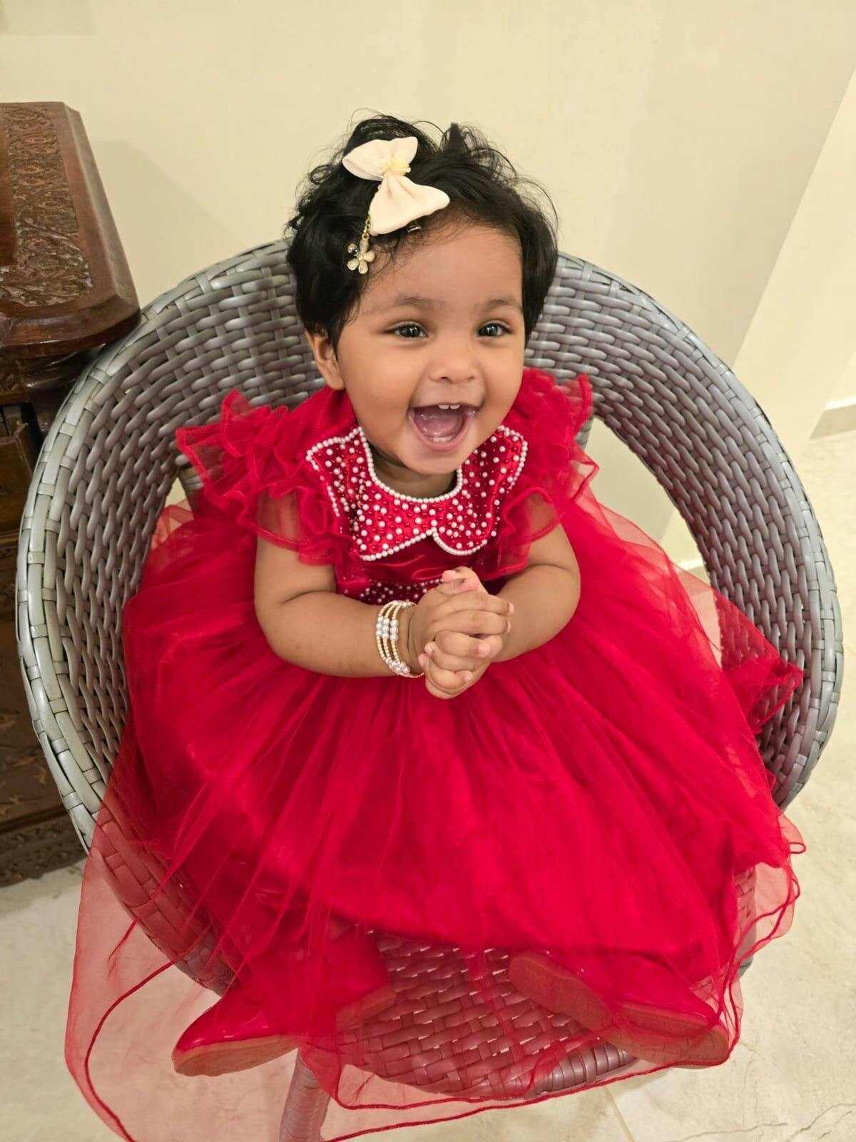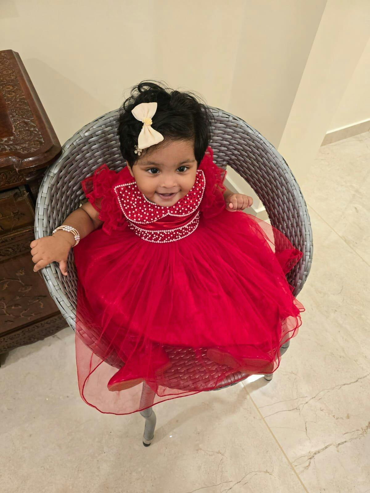 - Fabric: Bright Red mono net with premium same colour threadwork detailing on the yoke portion Beautifully designed outfit for Baby girls with smooth lining for comfort. It is non pricky.