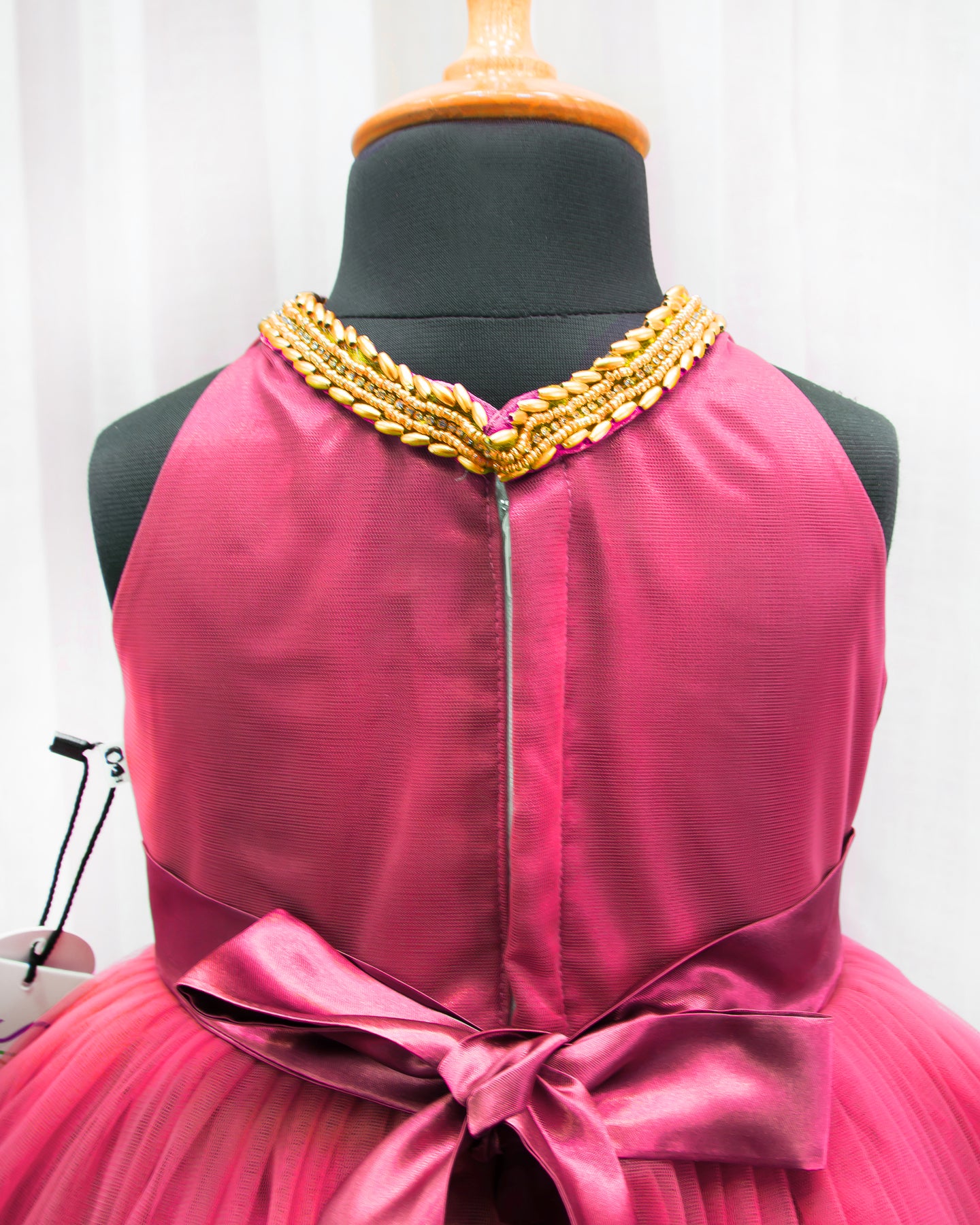- Material : Blush Pink soft mono nylon net is mainly used for making this dress. Yoke portion is designed in a pleated pattern with halter neck design. Skirt portion has 3 layered ruffles on bottom side. Centre portion and neck portion is highlighted with a golden hand embroidery lace.Soft cotton material is used as lining.