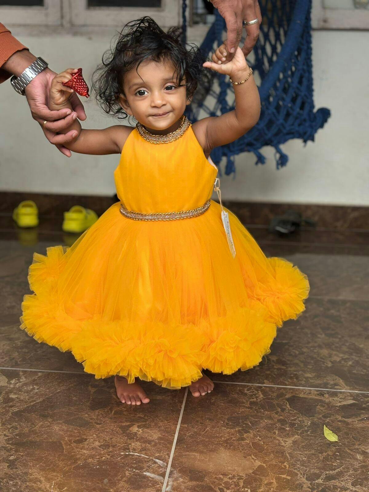 - Material : Mango Yellow soft mono nylon net is mainly used for making this dress. Yoke portion is designed in a pleated pattern with halter neck design. Skirt portion has 3 layered ruffles on bottom side. Centre portion and neck portion is highlighted with a golden hand embroidery lace.Soft cotton material is used as lining.