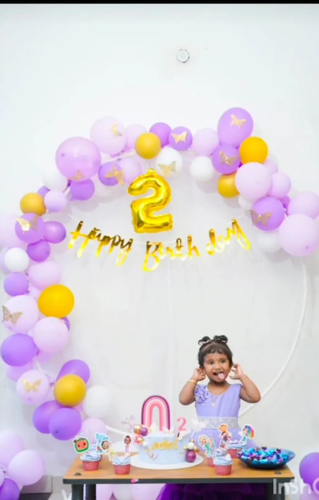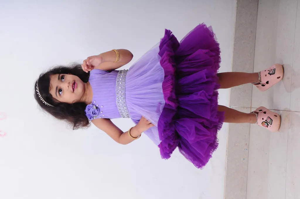 - Material: Lavender and Violet colour nylon net material is used in the upper portion and we are using Heavy quality ultra satin as the primary lining.This satin lining give the glossy feeling for the frock.In the yoke portion of the frock is stitched by pleating net and satin and give a Bunch of lavender cloth flower in the right side of the shoulder.