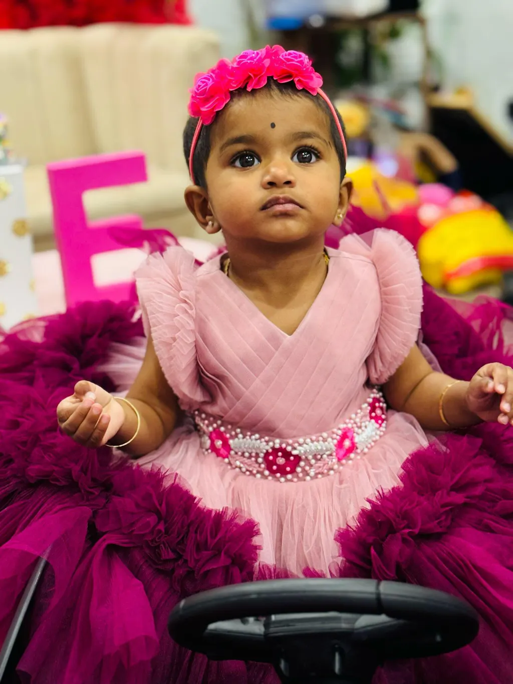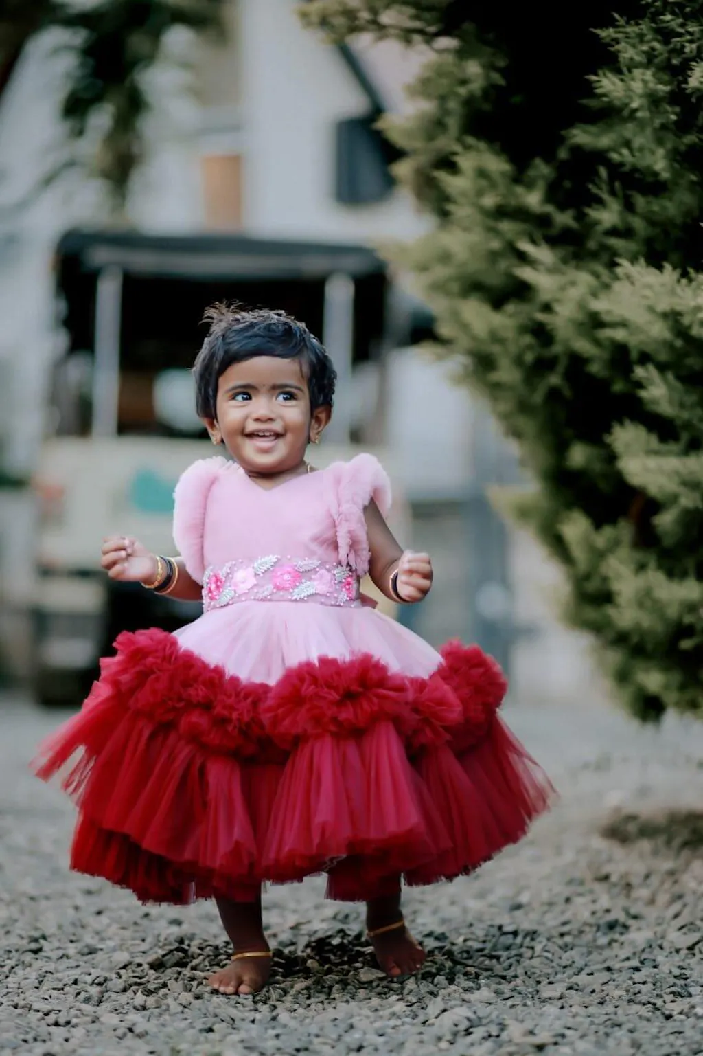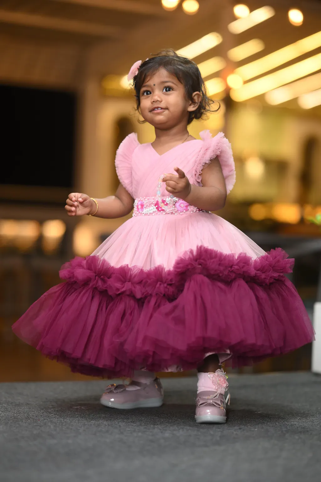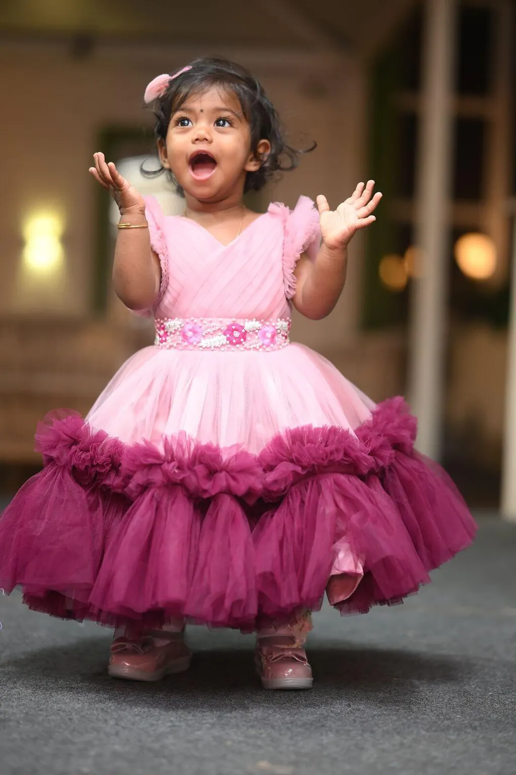 - Material : Dust Pink & Grapevine shade mono nylon net with handwork on center part. Neck is designed in pleated pattern with handworks on the belt part. Golden clutch stones, white & baby pink beads with golden glass beads. Bottom portion of the frock is designed in a pleated pattern with ruffles just above the pleats. A matching handwork flower is attached on the one side yoke portion for more pretty look. Premium matching colour ultra satin is used as lining. Inner portion is covered with premium ultra satin and white cotton lining.