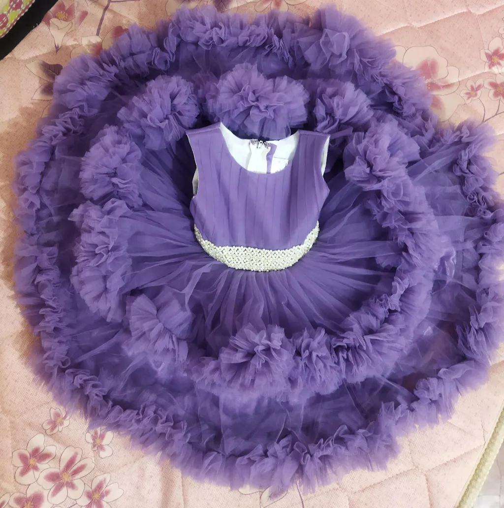 Material: Pastel Lavender shade mono nylon net with handwork on center part. Yoke part is designed in pleated pattern with handworked belt on the center part. White round pearls, Silver clutch stones are used in handworks . Bottom portion of the frock is designed as two layers with ruffles on each Layer. Premium matching colour ultra satin is used as lining. Inner portion is covered with premium ultra satin and white cotton lining.