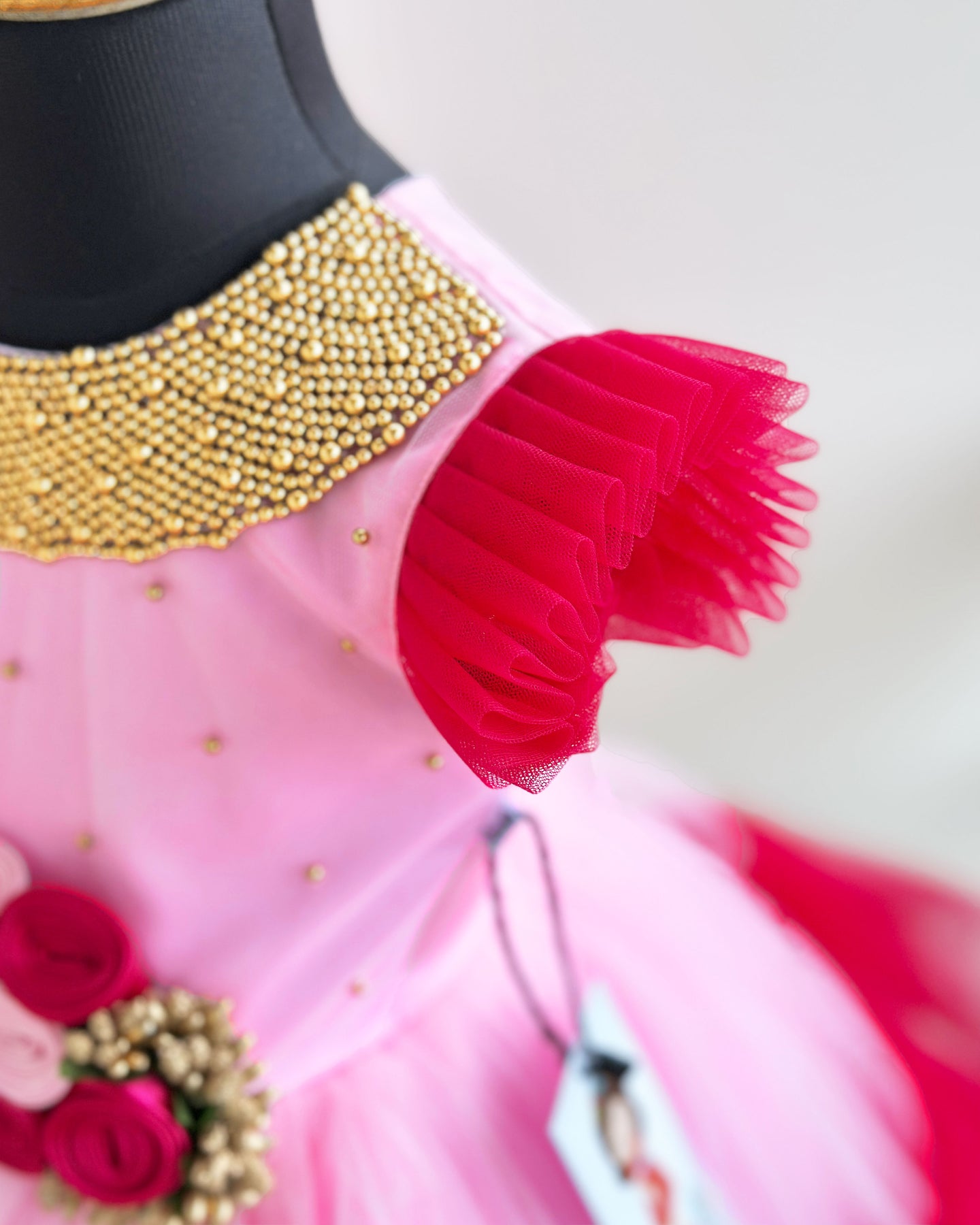 Baby Pink & Rany Pink shade handwork flower frock is made with soft nylon net fabric. The yoke portion of the frock is designed with handwork design. Golden colour beads are thickly covered on the neck part in round pattern and its spreaded on the body part. The centre portion of the frock is designed with handmade satin flowers which is fully filled with golden pollens. The skirt portion of the frock is designed as a flared pattern. End portion of net is filled with Rany Pink Ruffles. Back side of the dress has a matching satin tie for adjusting the fitness. Premium matching colour satin is used for net for glossy feel. Inner portion is covered with white shade high quality soft poplin lining.
