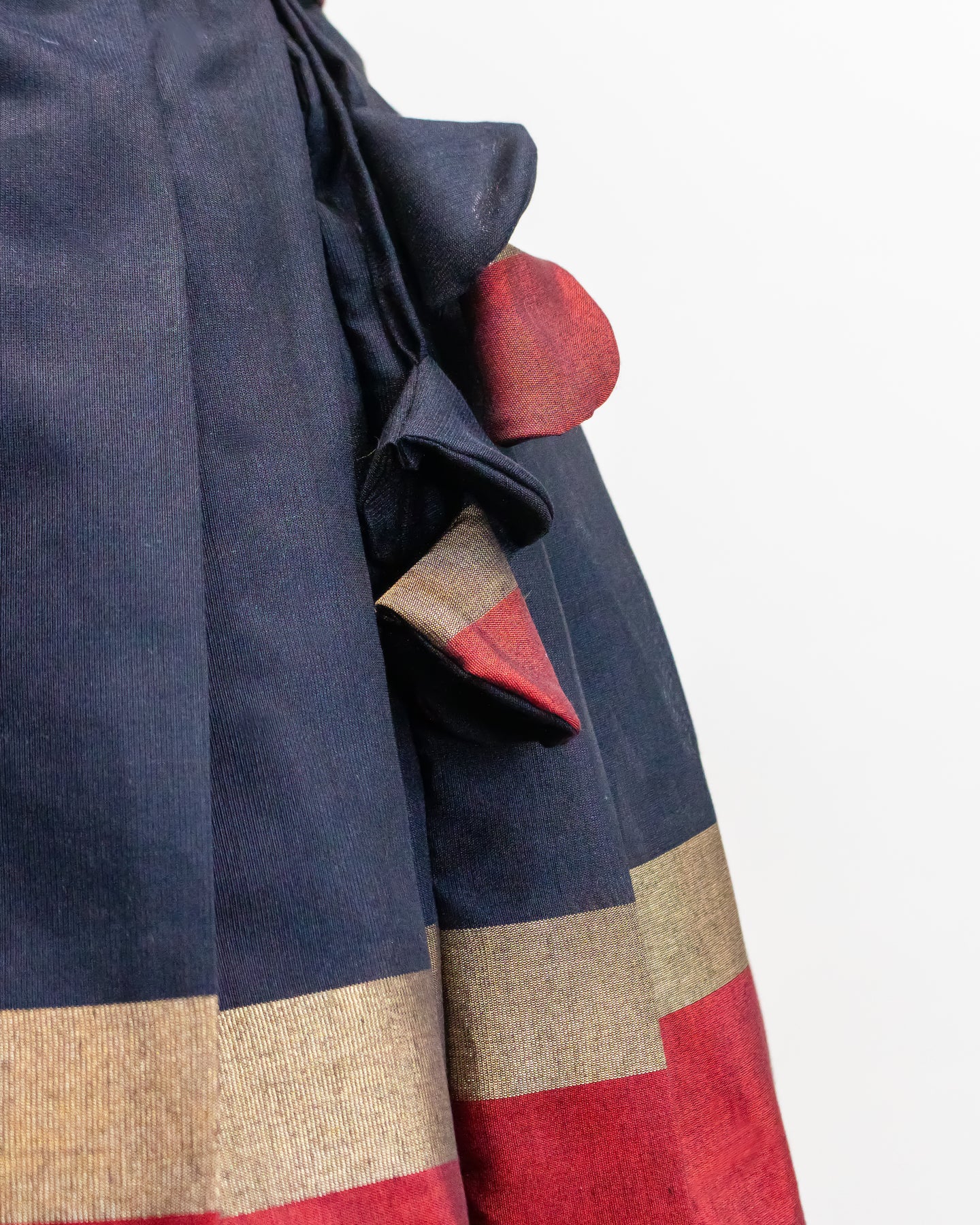 This Black & Red Banarasi Cotton Lehenga Choli features rich traditional colours and premium fabric, offering the perfect blend of comfort and ethnic elegance. The choli comes in a classic black shade with pleated cap sleeves and a festive Banarasi border in red and antique gold. The flared lehenga is highlighted with broad Banarasi borders, creating a royal, voluminous look that twirls beautifully. Made from soft cotton with superior stitching, this outfit ensures all-day comfort and lasting durability. The inner portion is fully lined with cotton fabric for added comfort.
