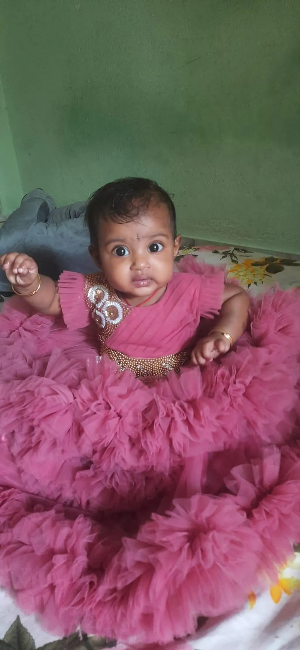 Material: Blush Pink nylon mono net with layered and ruffles on the end portion. Yoke portion is designed with pleated pattern and a handwork in the centre portion. Centre portion is highlighted with a golden stone worked lace for looking pretty.. Inner portion is covered with premium ultra satin and poplin cotton lining.