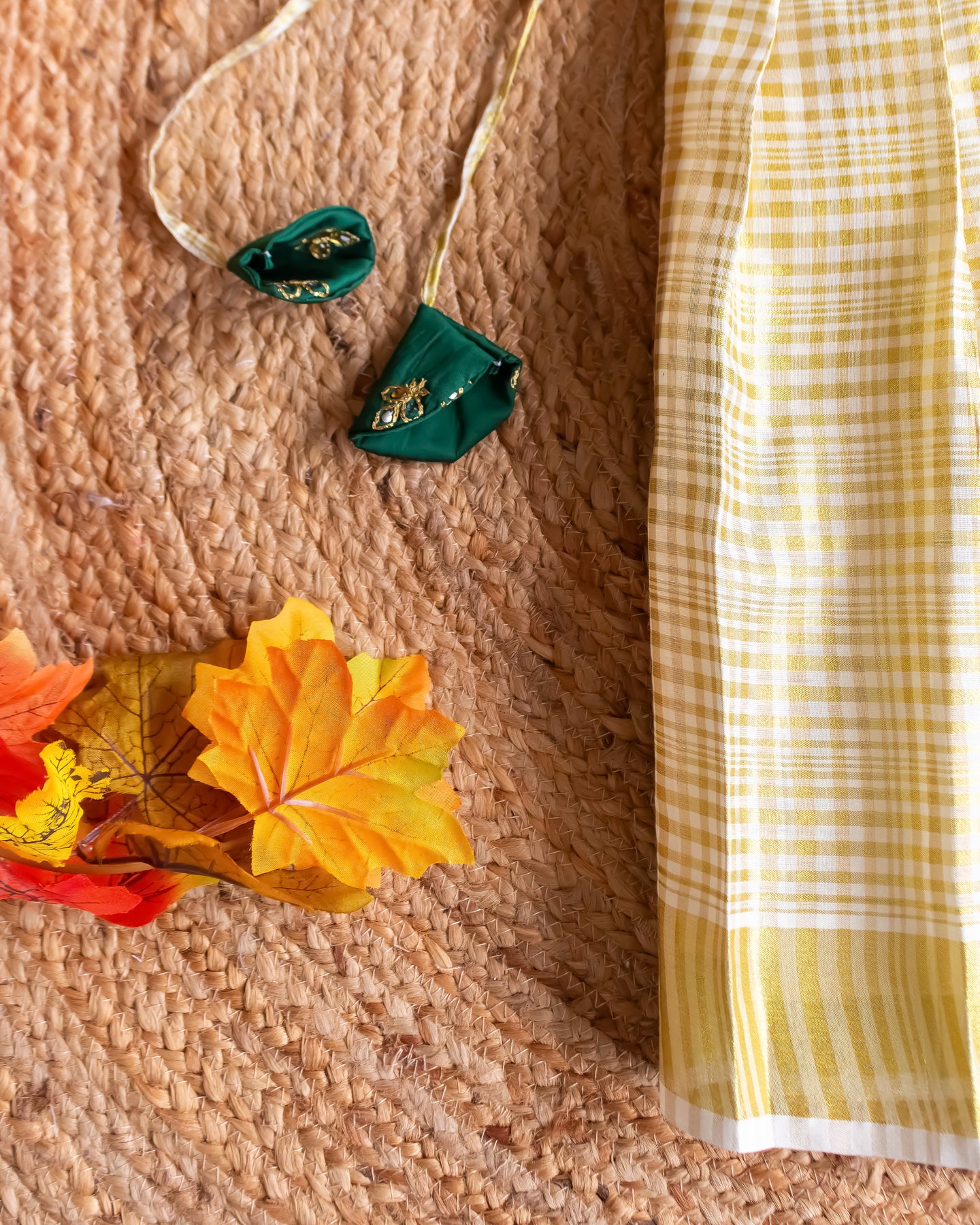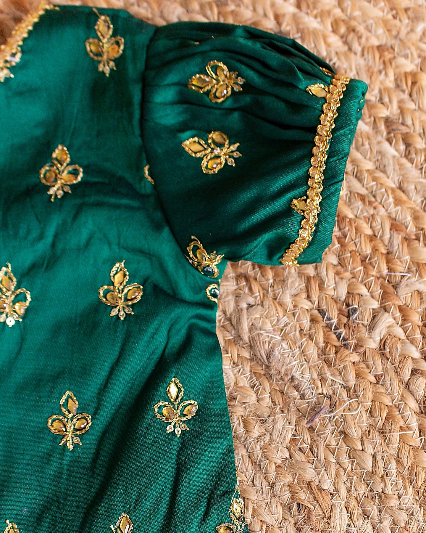 Bottle Green & Cream Shade Kasavu Lehenga is made with soft Kerala tissue silk fabric. This combination creates a rich, contrasting colour palette, giving a visually striking and festive look for your little one. The blouse is made with bottle green slub silk fabric. Golden embroidery material is added to enhance its beauty. A small puff sleeve is given for a traditional look. The back portion of the blouse has a long zipper for easier opening and closing. The inner portion is lined with high-quality soft poplin cotton for added comfort.