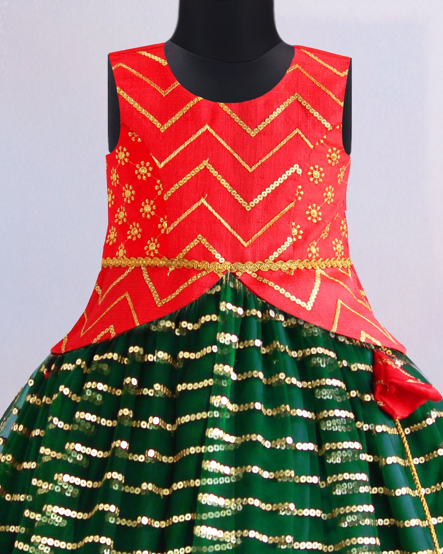 Bottle Green self-sequins embroidery soft quality net with premium ultra-satin inside for shining. Bright Red Fantom silk fabric with sequins embroidery material . Beautifully designed outfit for baby girls with smooth lining and extra comfort. It is not pricky. Bottle Green colour net with mehndi shade sequins spread all over in line pattern. Inside premium satin cloth for glossy with cotton lining (comfort). Make your little one shine with traditional grace in this Bottle Green & Red Combo Lehenga Choli from Stanwells Kids. Beautifully crafted from premium silk fabric, this readymade outfit features intricate hand-sequins embroidery that adds a festive sparkle to every twirl. The elegant bottle green flared skirt pairs perfectly with the rich red embroidered blouse, creating a striking South Indian traditional look. Designed for comfort and style, it’s an ideal choice for festivals, weddings, temple visits, and family celebrations.