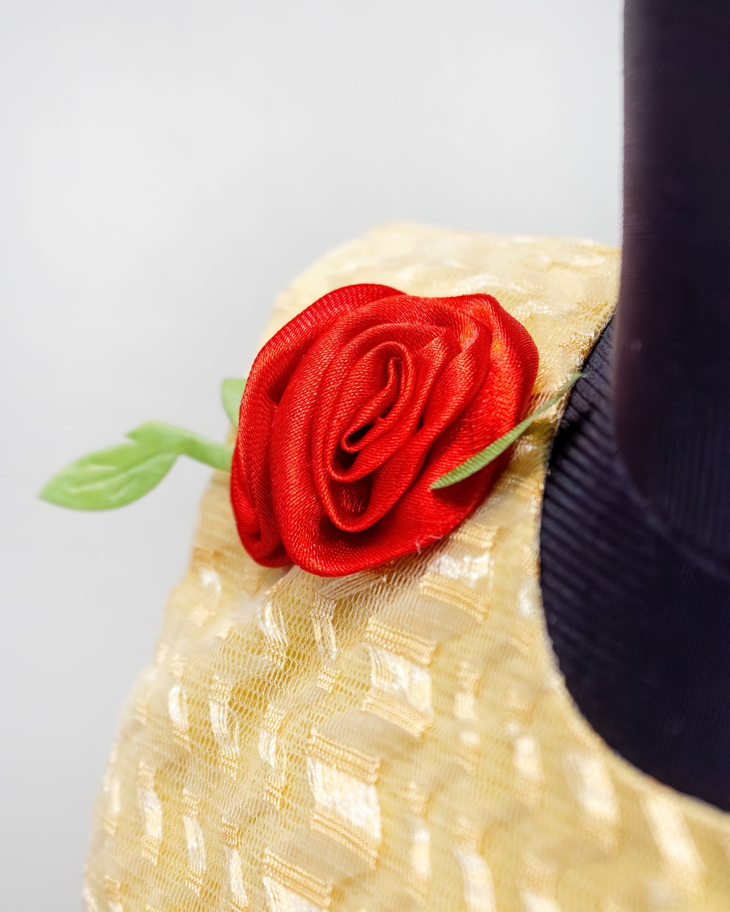 Golden Designer Flower Frock is made with soft nylon zigzag net fabric. The yoke portion of the frock is designed with a simple look. The skirt portion is made in a normal flared pattern. The side of the belt is beautifully decorated with bright red satin flowers, complemented with green leaves. The right shoulder also features a red satin flower. The back of the frock has a matching satin tie for adjusting the fit. Premium matching satin is used under the net for a glossy feel. The inner portion is lined with high-quality white soft poplin fabric.