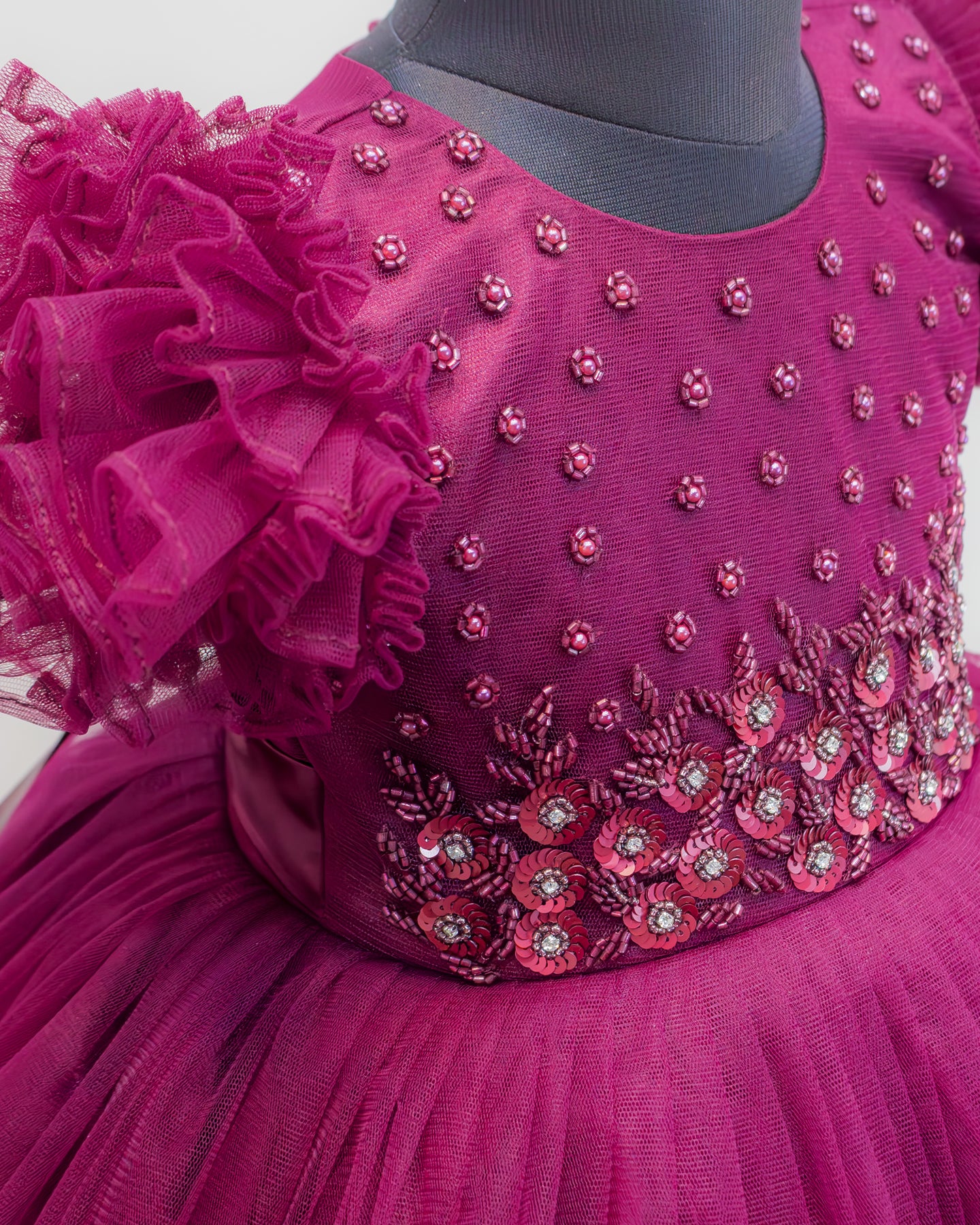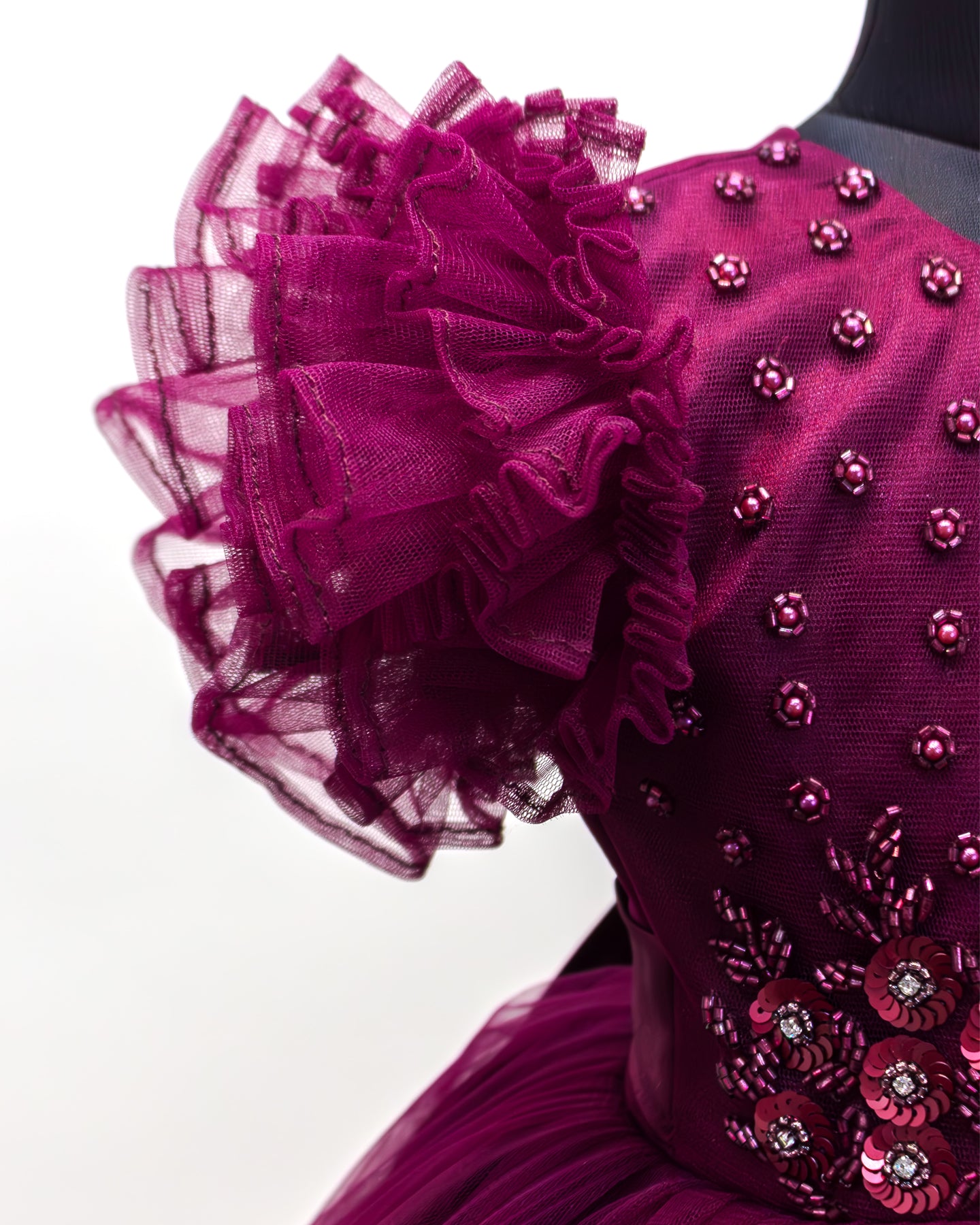 Grapevine Shade Heavy Handwork Baby Girls Party Wear Birthday Frock is made with soft mono nylon net. The yoke portion of the frock is beautifully designed in Heavy Handwork with Vine colour cut beads and sequins. Skirt portion of the frock is designed in flared pattern. End portion of the skirt part is designed with same colour ruffles. Premium quality ultra-satin is used as the main lining. Back side has matching satin for adjust the fitness. Inner portion is fully covered with white cotton fabric.
