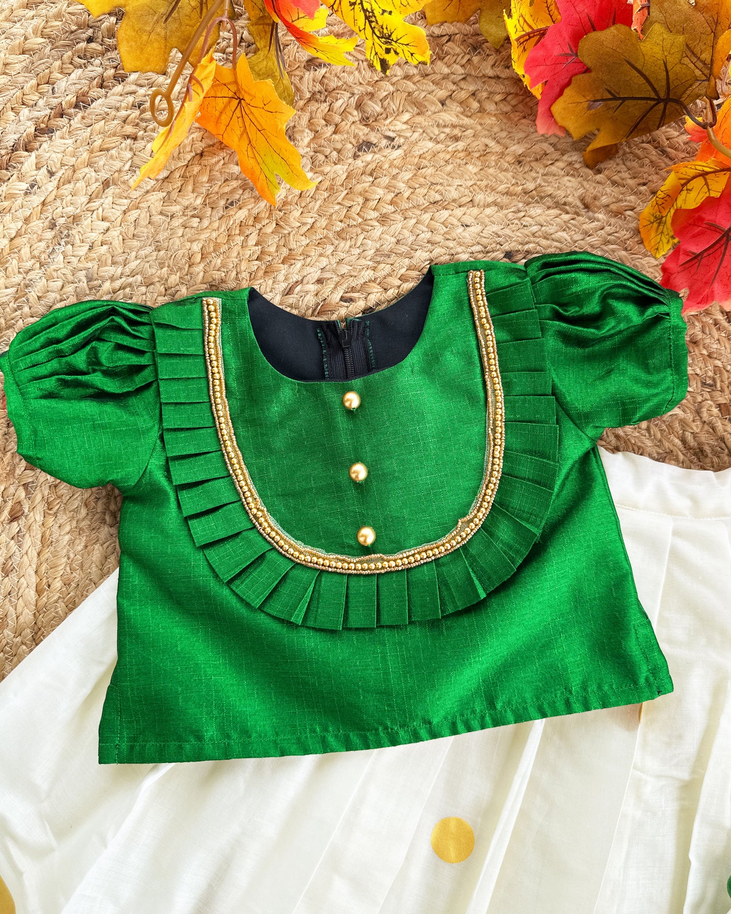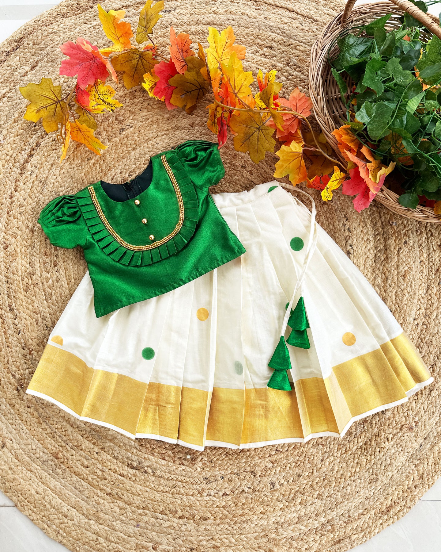 Cream & Green Combo Onam Special Kerala Kasavu Lehenga Choli is a traditional and elegant ensemble designed for the Onam festival. The combination of cream and green shades with Kasavu embroidery is a beautiful representation of traditional Kerala craftsmanship. The Kasavu fabric, typically featuring a golden border, adds an elegant touch. The body part of the blouse is beautifully designed with three Golden colour beads. The inner portion is covered with high quality soft poplin cotton lining.