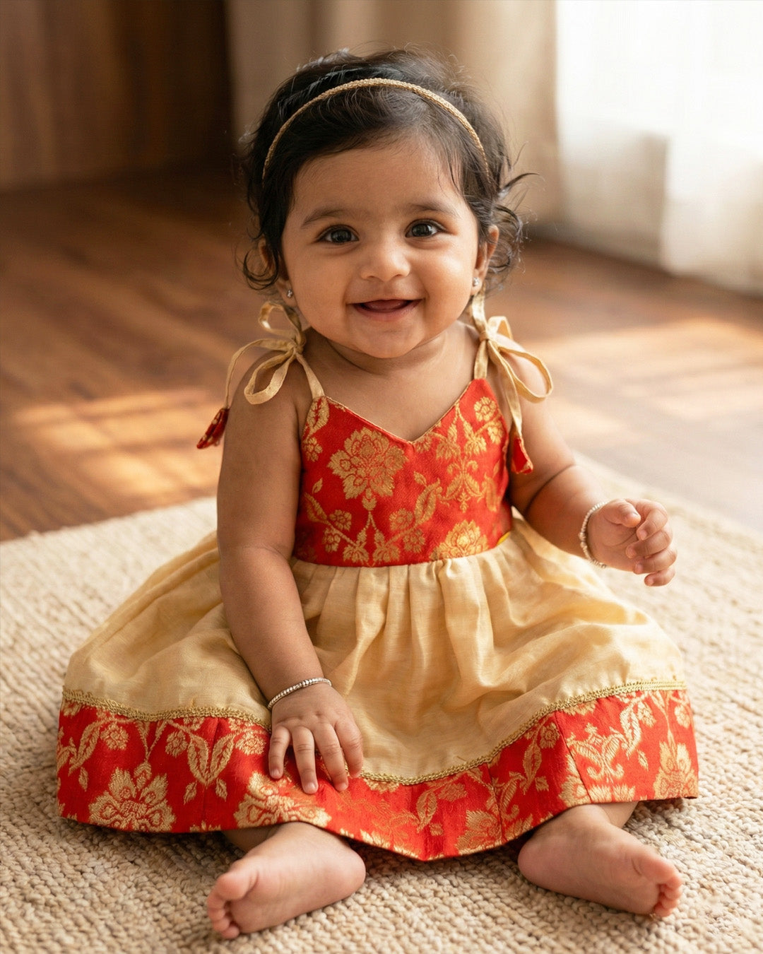 Traditional silk frock designed for newborn baby girls for naming ceremonies and festive functions. Rich green and red colour combination adds a classic ethnic charm to the special occasion. Soft inner lining ensures comfort for your baby during long hours of wear. Lightweight and breathable fabric suitable for newborn and infant wear. Ideal gift option for naming day, family functions, or temple visits.