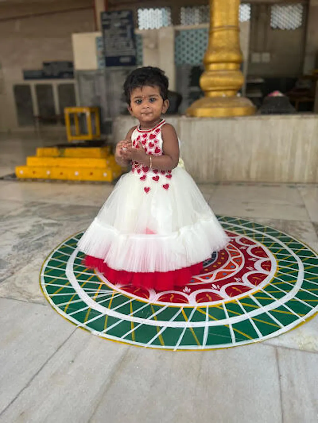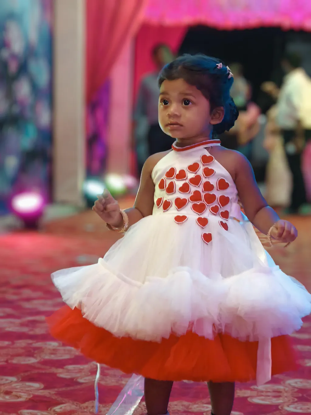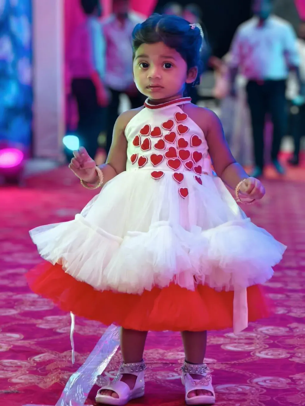 - Off-White Shade Heart Shape Embroidery Handwork Baby Girls Partywear Frock is made with soft nylon net fabric.Yoke portion is spreaded with heart shape beads work . Each heart is filled with red color beads. The skirt portion of the frock is designed in a flared pattern. The end portion of the frock is beautifully designed with red shade ruffles . Premium matching colour satin is used under net for a glossy feel. Inner portion is covered with white shade high quality soft poplin lining.