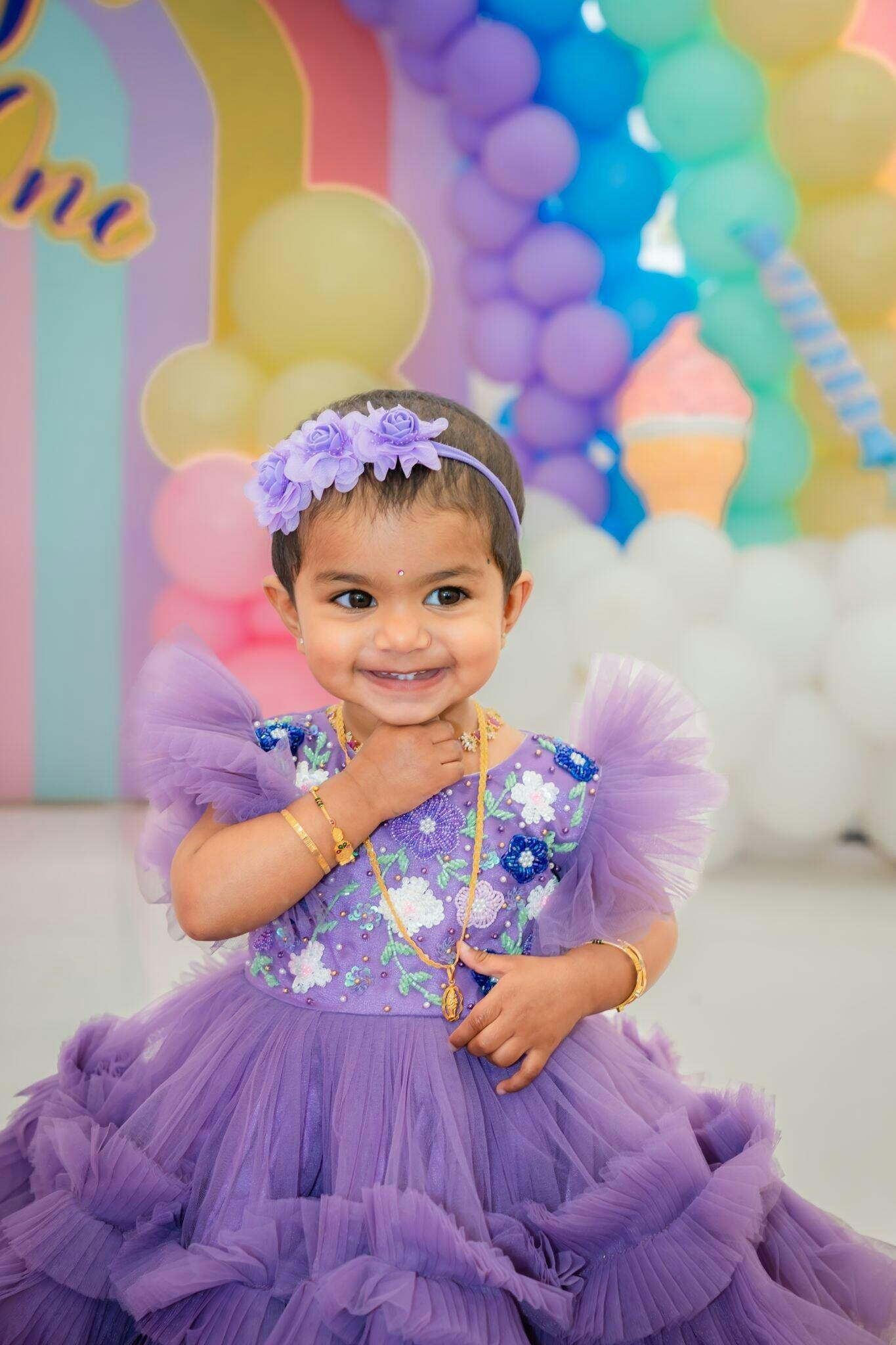 - Pastel Lavender Shade Handwork Party Wear Birthday Frock is made with soft mono nylon net fabric.Yoke portion is beautifully designed with beads works . The outfit is adorned with intricate handwork, such as embroidery, beading, or sequins. Its elegant color and detailed handwork make it a perfect choice for those looking to stand out in a refined and stylish manner.Skirt portion is designed with same shade heavy ruffles pattern. The end portion of the frock is designed with long and short ruffles pattern. Premium matching colour satin is used for net for glossy feel. Inner portion is covered with white shade high quality soft poplin lining.