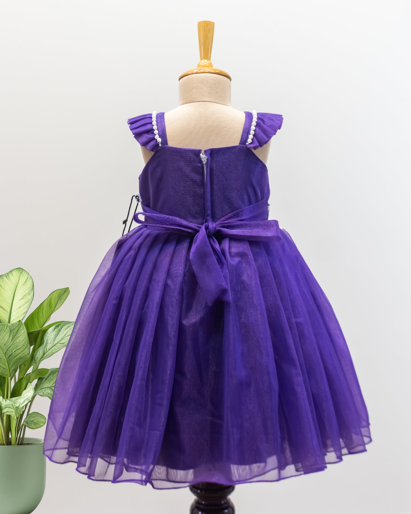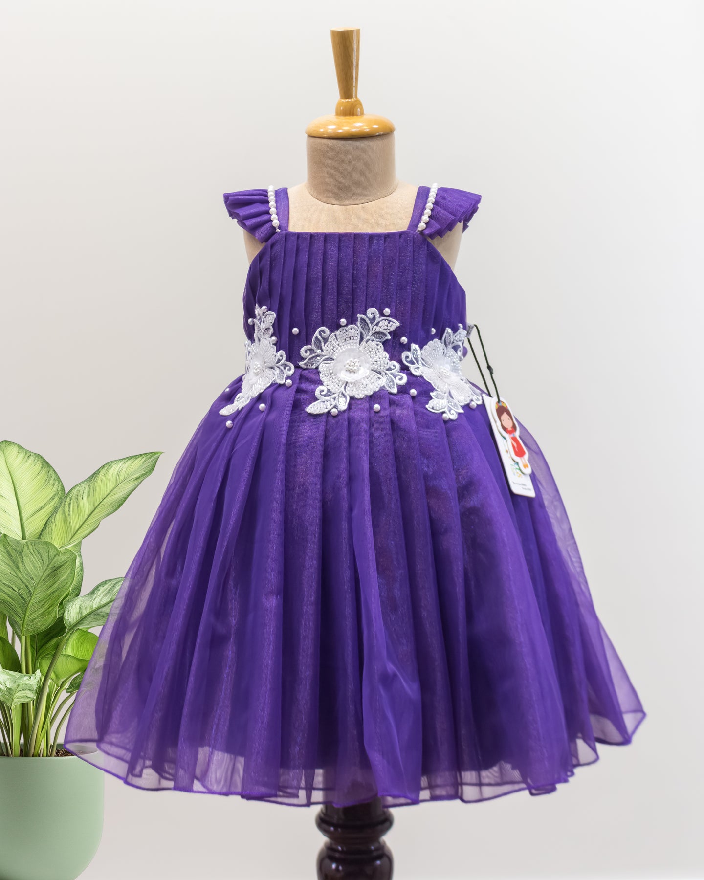 Pastel Violet Shade Shimmer Net Partywear Flower Applique Frock is made with shimmery net material. Yoke portion designed in a pleated pattern. Centre portion is highlighted with white flowers for pretty look. Skirt portion of the frock is designed in pleated pattern. A square neck pattern will give an elegant look for the frock. A pleated sleeves attached for an elegant look. Premium quality ultra-satin is used as the main lining. Back side has matching satin for adjust the fitness. Inner portion is fully covered with white cotton fabric.