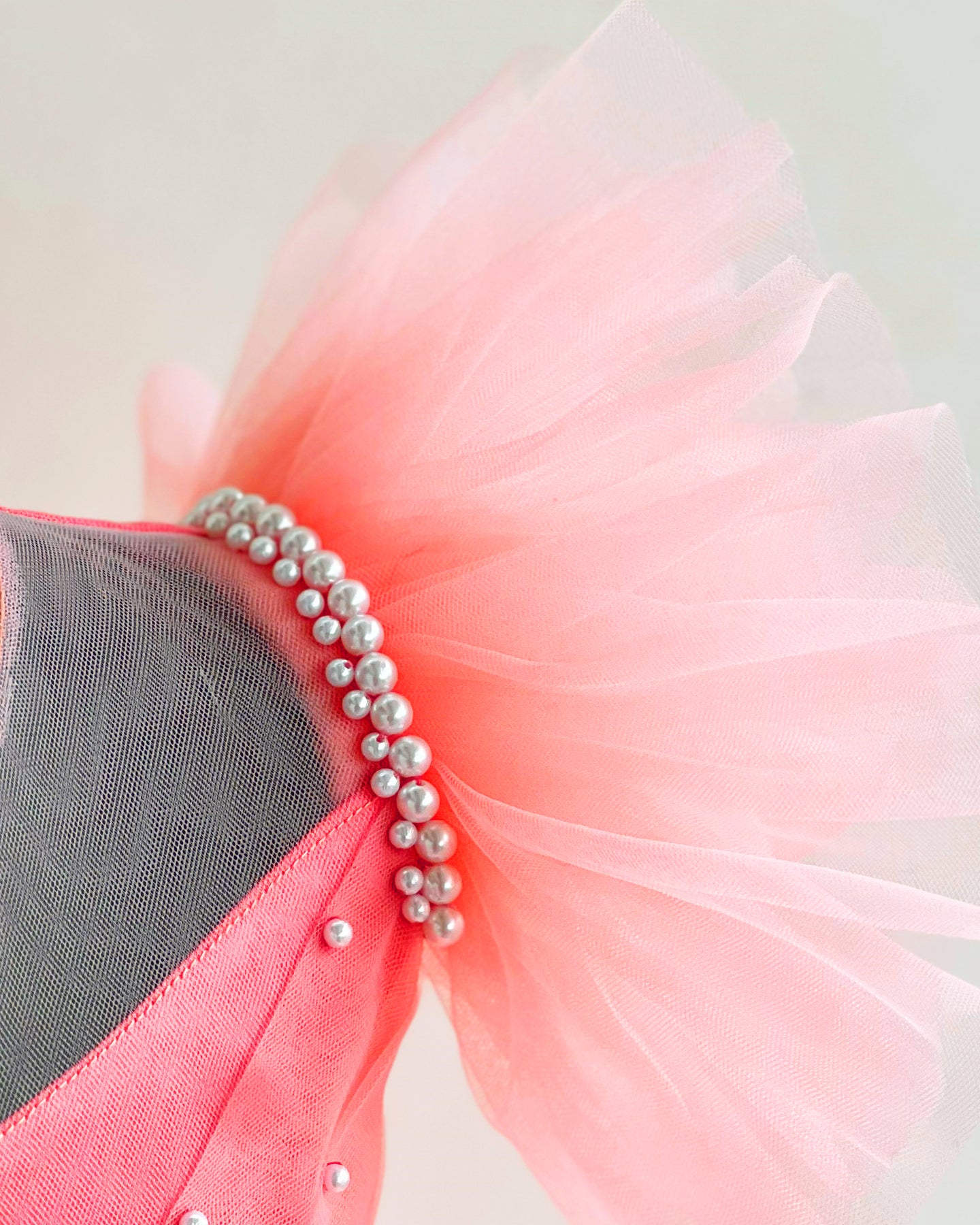 - Peach Shade Pleated Western Style Partywear Frock is made with soft mono nylon net fabric. The yoke portion is beautifully arranged with cross pleated with transparent Neck. The Skirt portion of the frock is designed with normal flared pattern. And beads spreaded all over the yoke portion. One layer beads attached on the sleeves. Back portion of the frock has a matching satin back bow for attaching the fitness. Premium matching colour satin is used for net for glossy feel. Inner portion is covered with white shade high quality soft poplin lining.