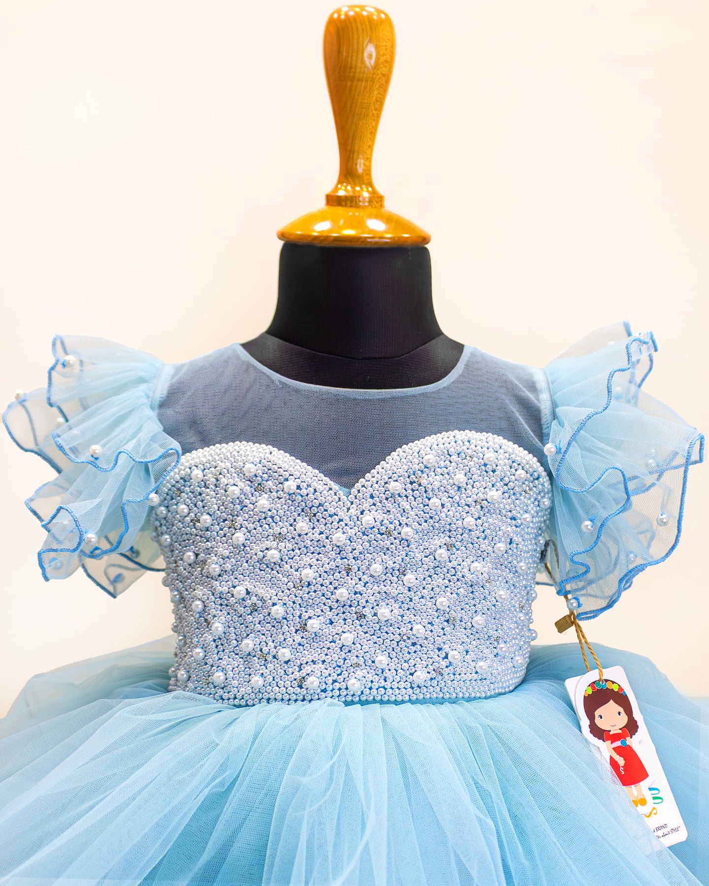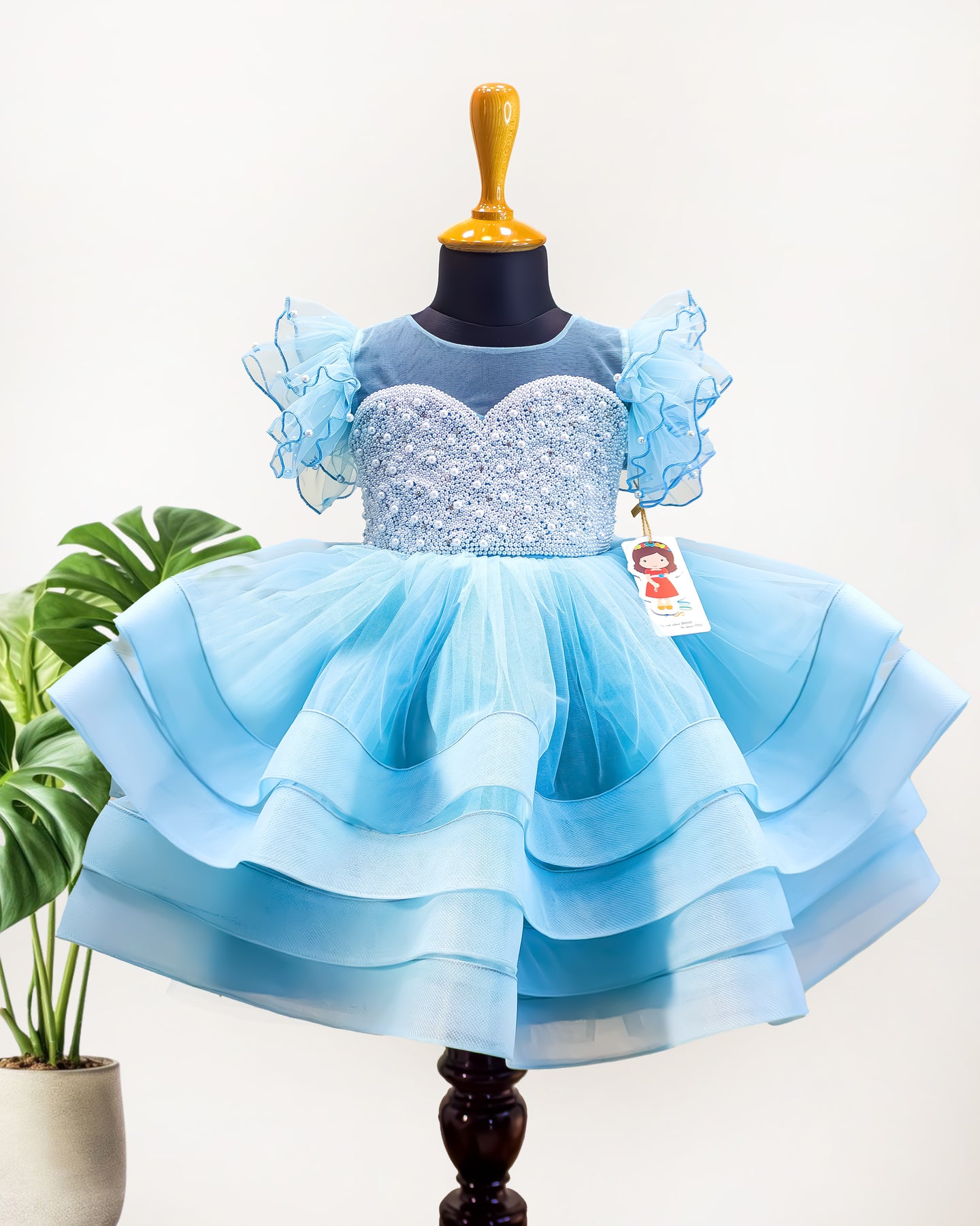 Pearl Blue Heavy Handwork Baby Girls Premium Party Wear Step Frock is crafted from soft mono nylon net material. The yoke is beautifully designed with white beads and stone embellishments. The skirt features a Pearl Blue shade with a four-layered step pattern. The hem of the skirt is finished with stiff borders, giving it a rich and puffy appearance. Premium-quality ultra satin is used for the main lining, while the back side has matching satin for adjustable fitting. The inner portion is fully lined with soft white cotton fabric to ensure maximum comfort for your little one.