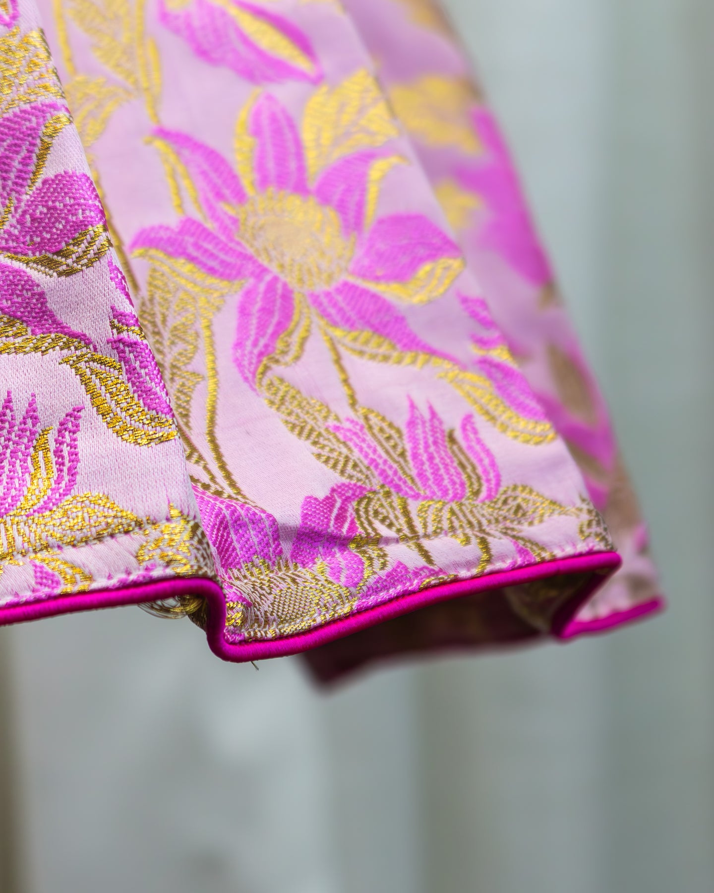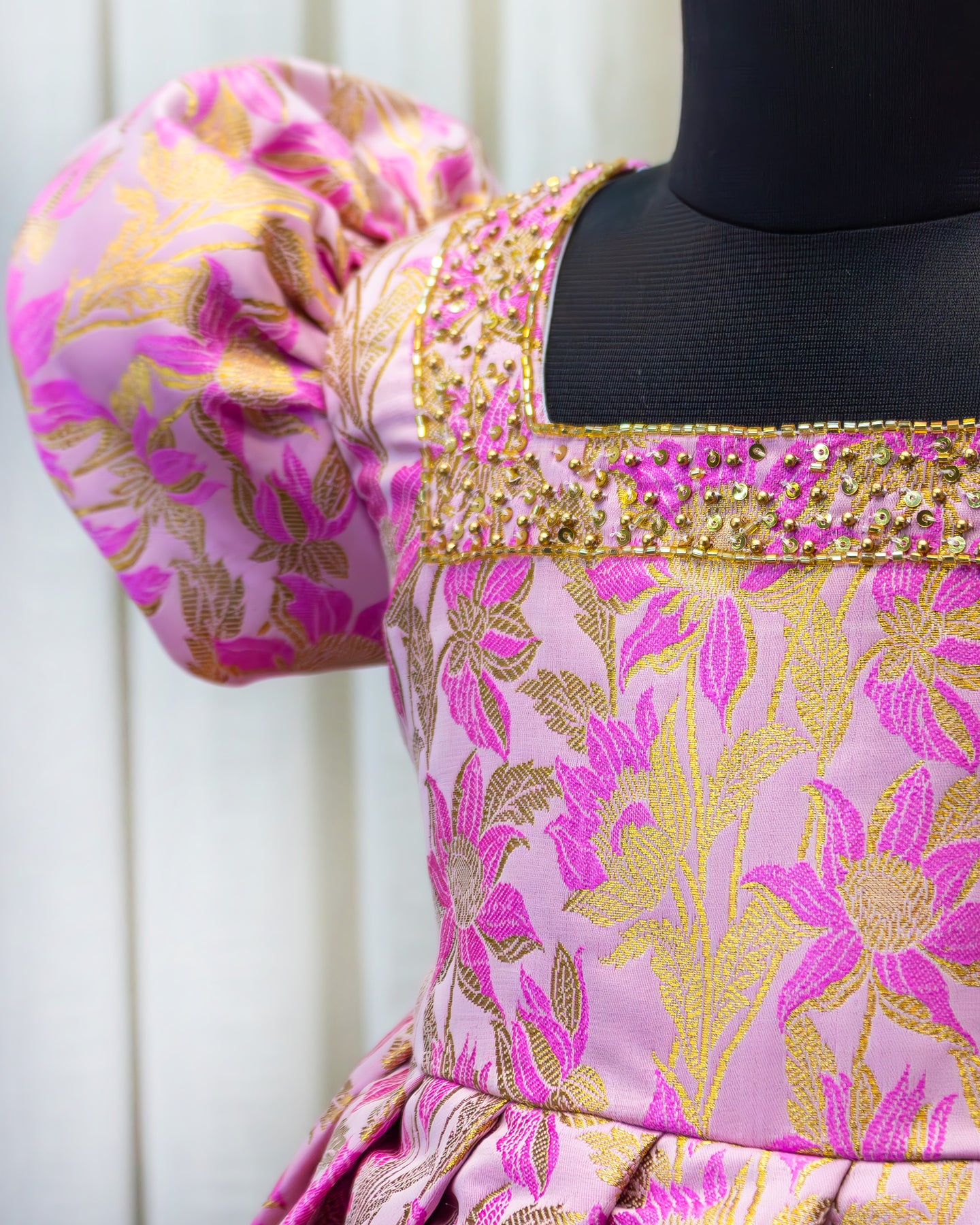 Pink Shade Designer Brocade Frock is made brocade fabric. The yoke portion of the frock is designed in a normal pattern with square neck. The neck potion is filled with handwork which looks so elegant. Golden beads are used for making the handwork on the neck part. The skirt portion of the frock is designed as normal pleated pattern. Back portion of the frock has a matching silk tie for adjusting the fitness. Premium matching colour satin is used for net for glossy feel. Inner portion is covered with white shade high quality soft poplin lining.