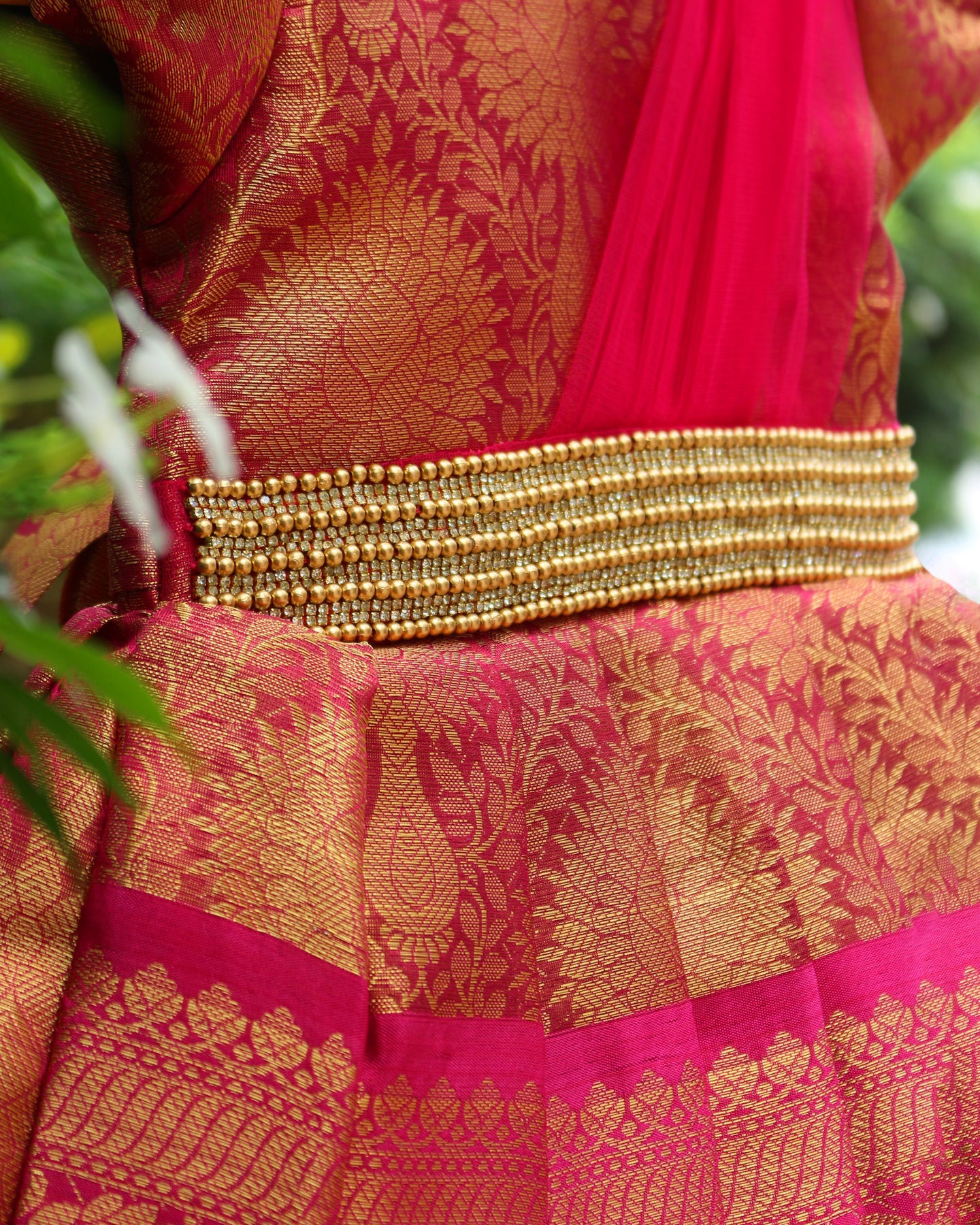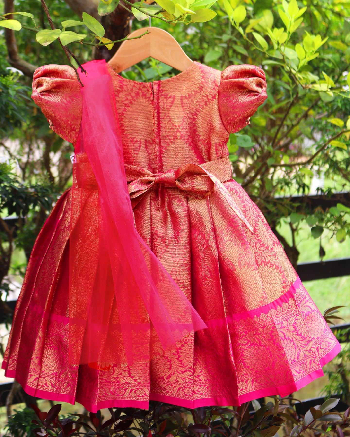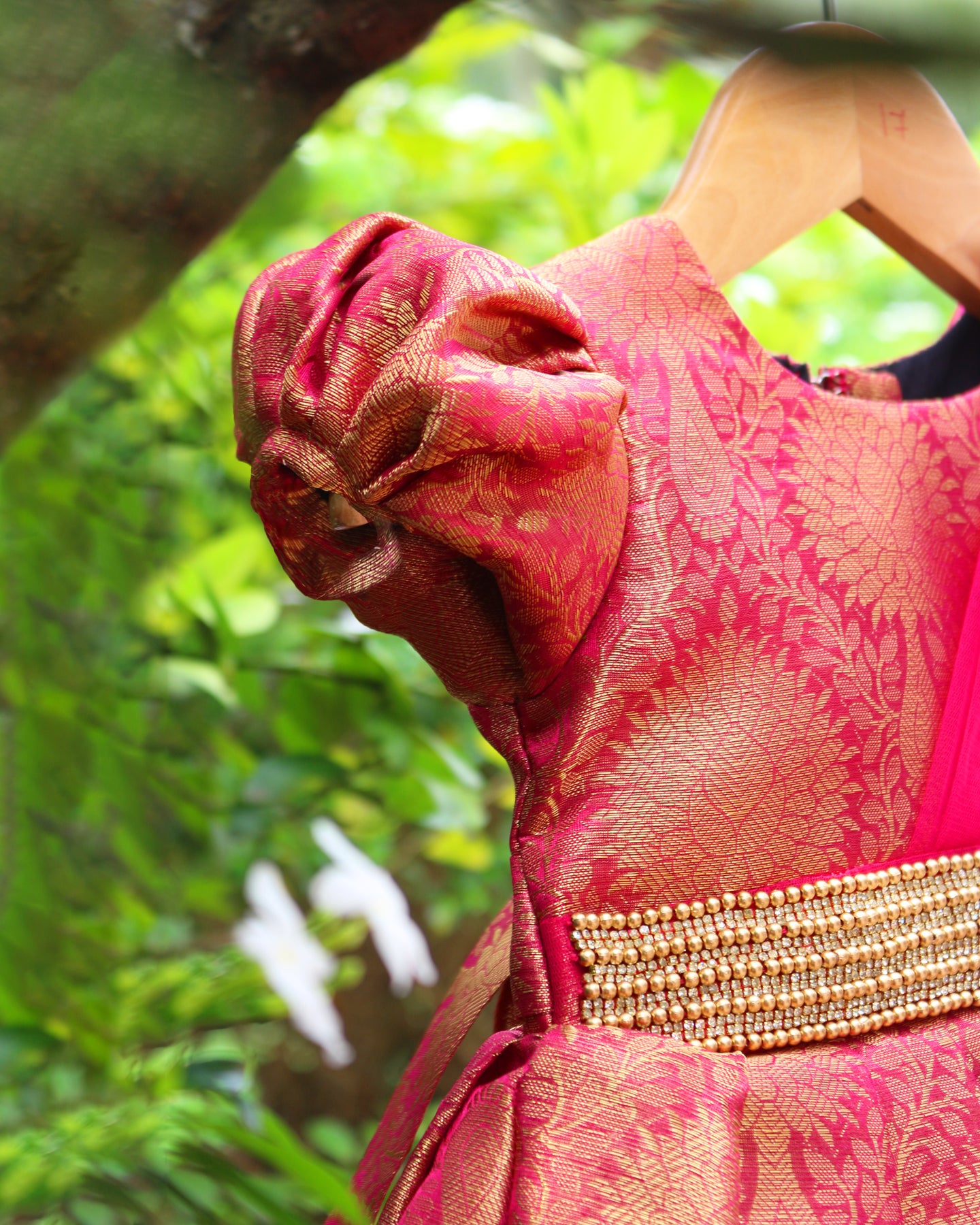 Pink Jacquard Handwork Silk Frock is made with soft silk fabric. The yoke portion of the frock is designed in a semi dhavani pattern. A saree type pleats is given on one side of the frock .The center potion is filled with a heavy handwork belt which looks so elegant. Golden beads and silver stones are used for making the handwork on the centre part. The skirt portion of the frock is designed as normal pleated pattern .Back portion of the frock has a matching silk tie for adjusting the fitness. Premium matching colour satin is used for net for glossy feel. Inner portion is covered with white shade high quality soft poplin lining.