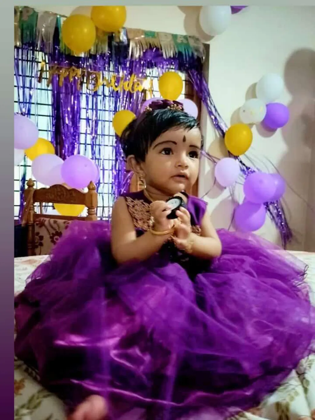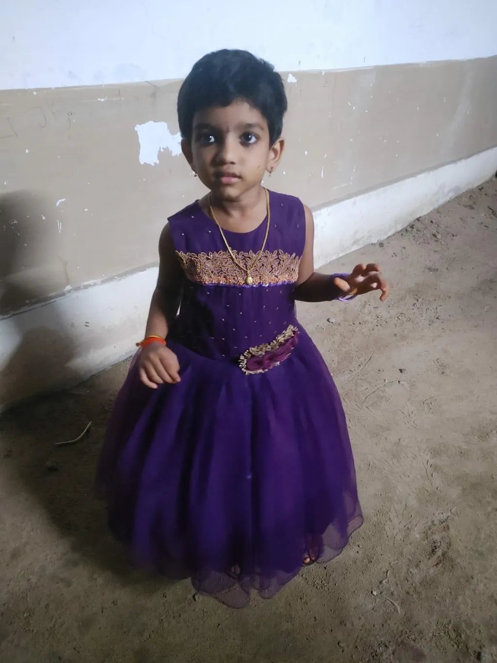 - Material: Purple colour nylon net material is as the main fabric.Inside that material same colour satin cloth is used for more shinning.Yoke portion is highlighted with Golden babypink and Purple heavy handwork. Centre portion has a bunch of satin flowers for more beauty. Black colour cotton soft lining is used on innerportion