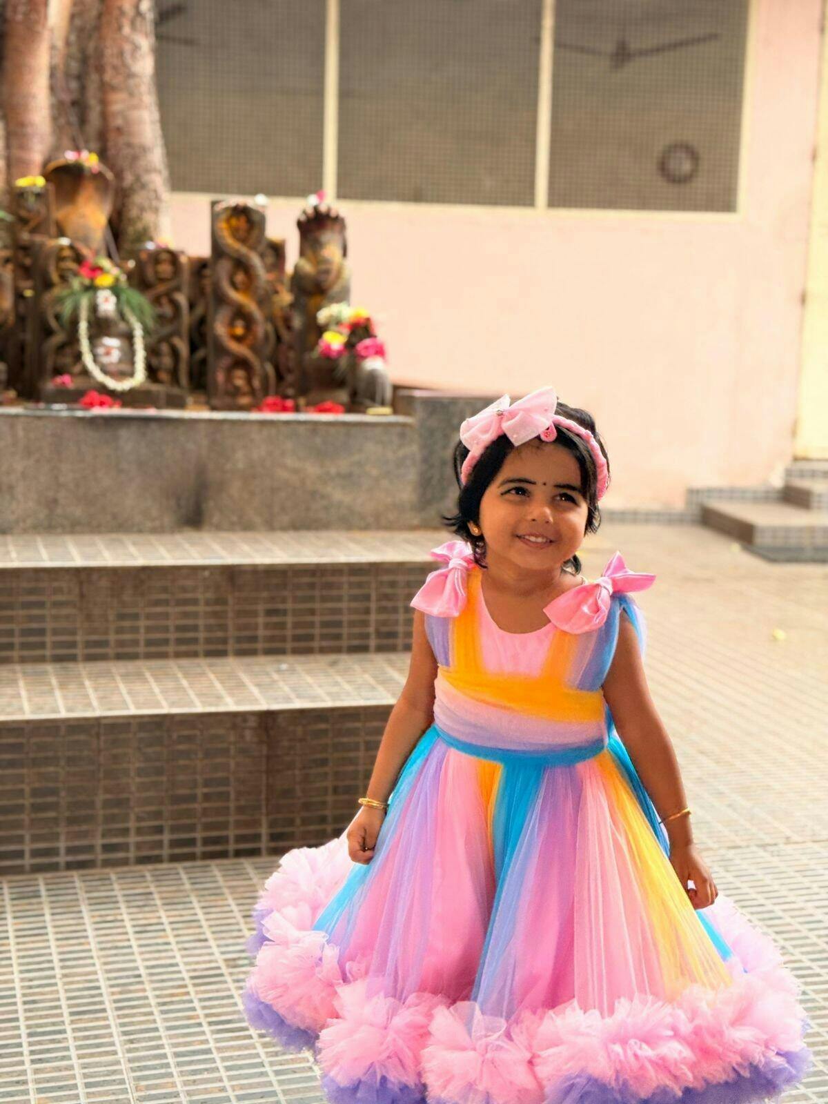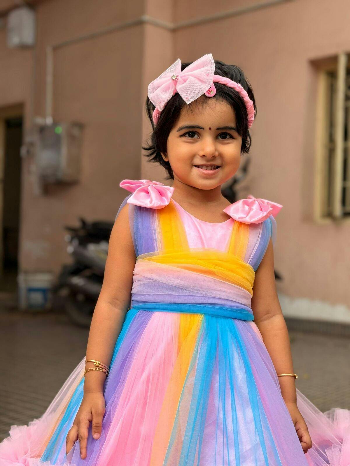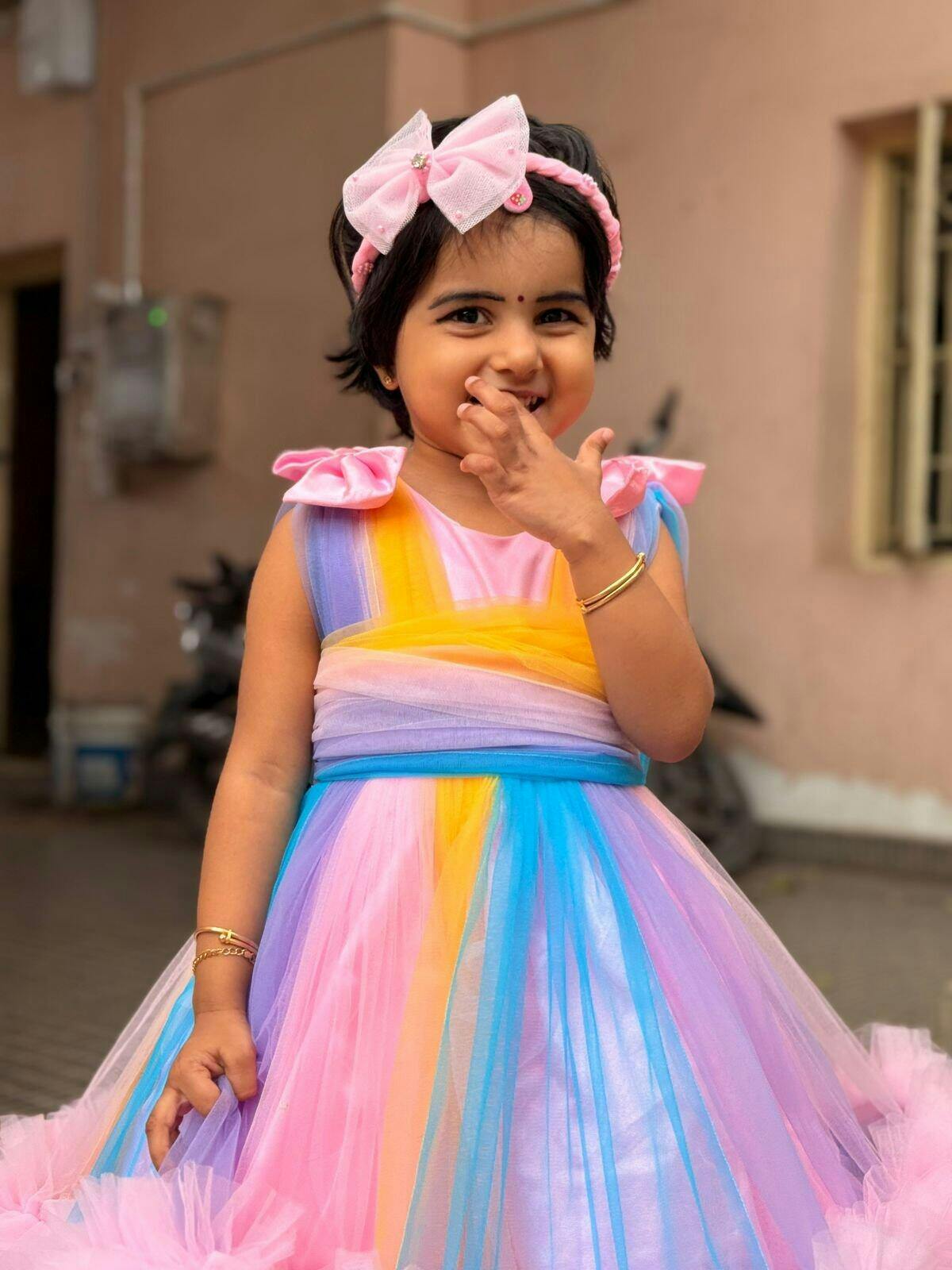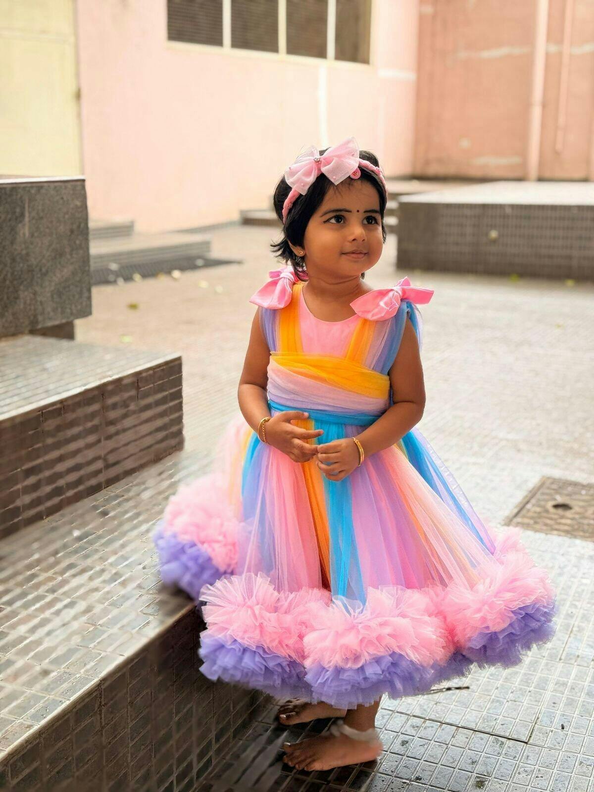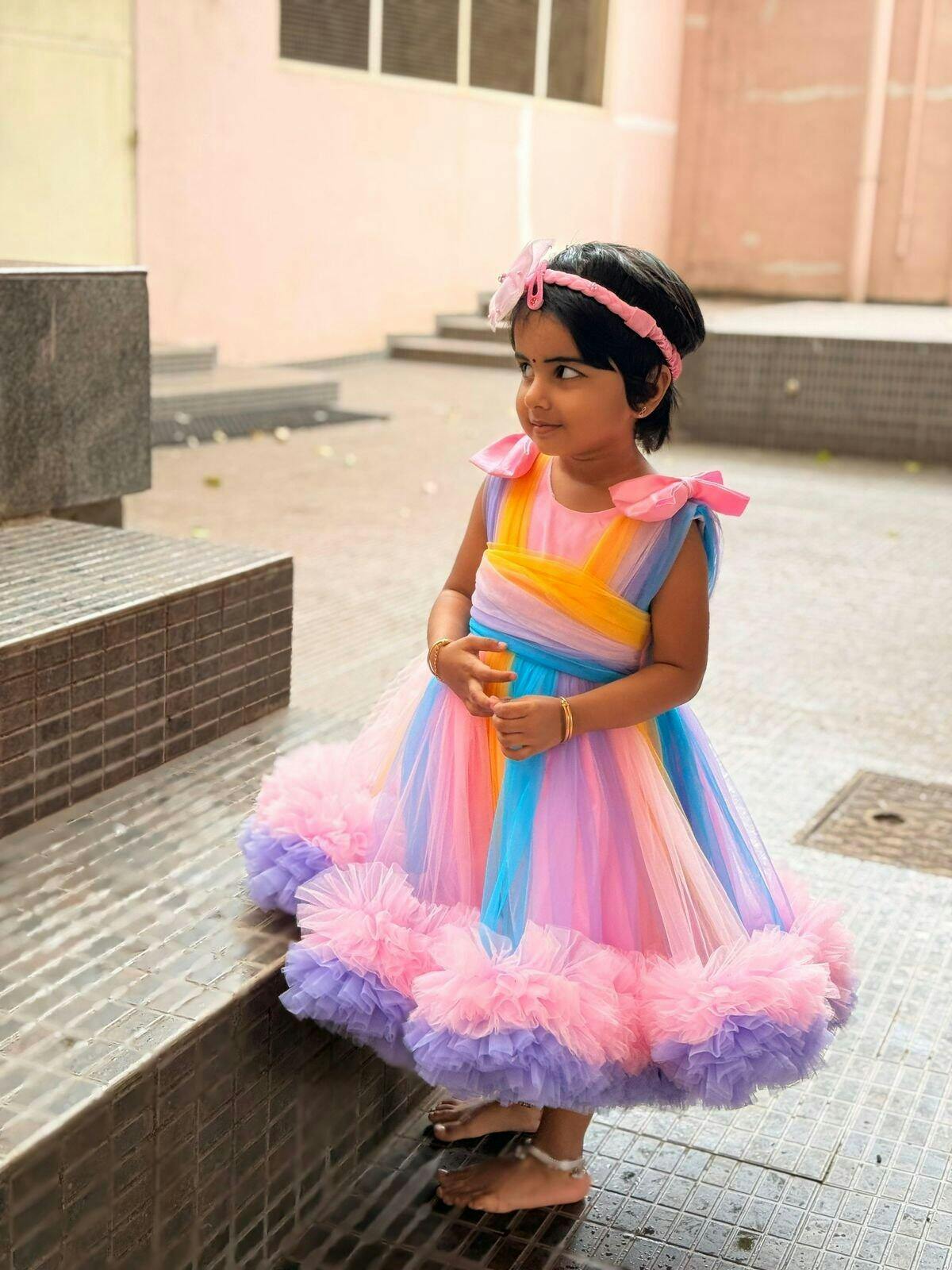- Rainbow Theme Multi Colour Party Perfect Heavy Ruffles Birthday Frock is made with soft nylon net fabric. Combination of rainbow colours made this frock so beautiful. The yoke portion is designed with Pleated pattern. Skirt portion is designed with multi colours and heavy ruffles in lavender and baby pink. Belt portion is designed with multi-colour net fabric to look more beautiful .Premium matching colour satin is used under net for a glossy feel. Inner portion is covered with white shade high quality soft poplin lining.