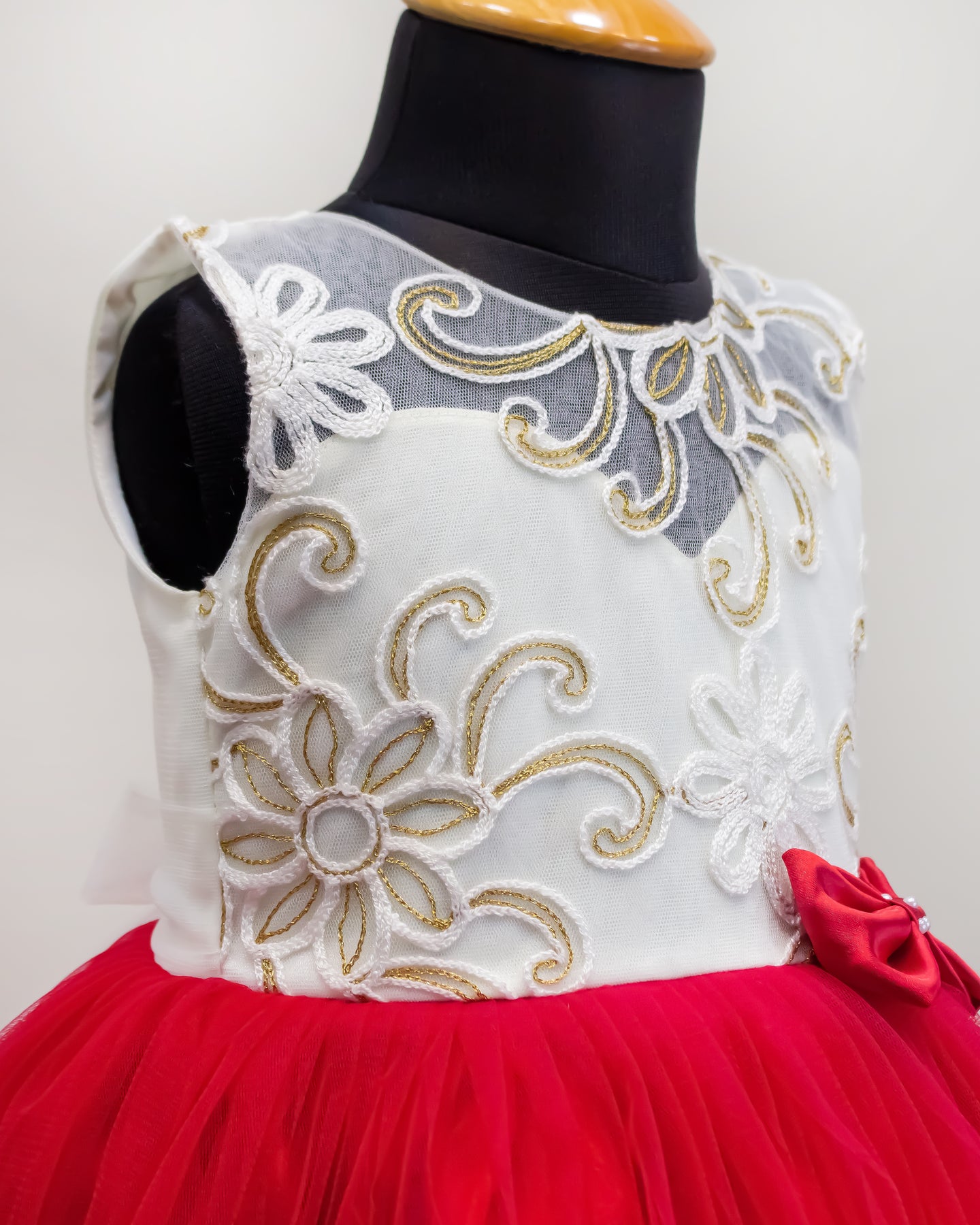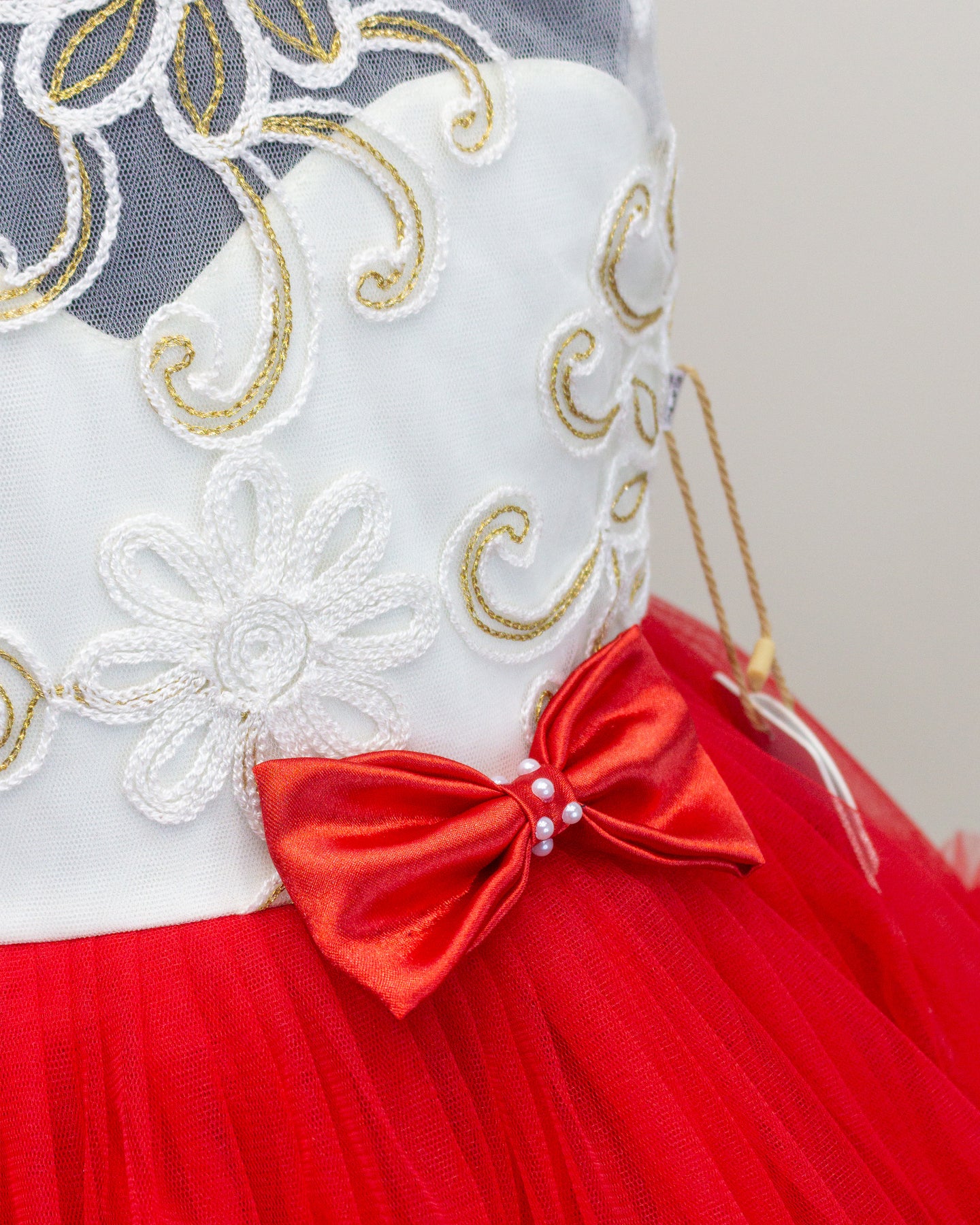 The Red & Off-White Baby Girls Christmas Frock is made with soft mono nylon net material. The yoke portion is designed with white embroidered fabric. A red bow is attached to the belt area of the frock. The skirt portion is crafted in a pleated pattern with ruffles just above the pleats. The back of the dress has a matching satin tie for adjusting the fit. Premium matching-colour ultra-satin is used as the lining. The inner portion is fully covered with premium ultra-satin and white cotton lining for added comfort.