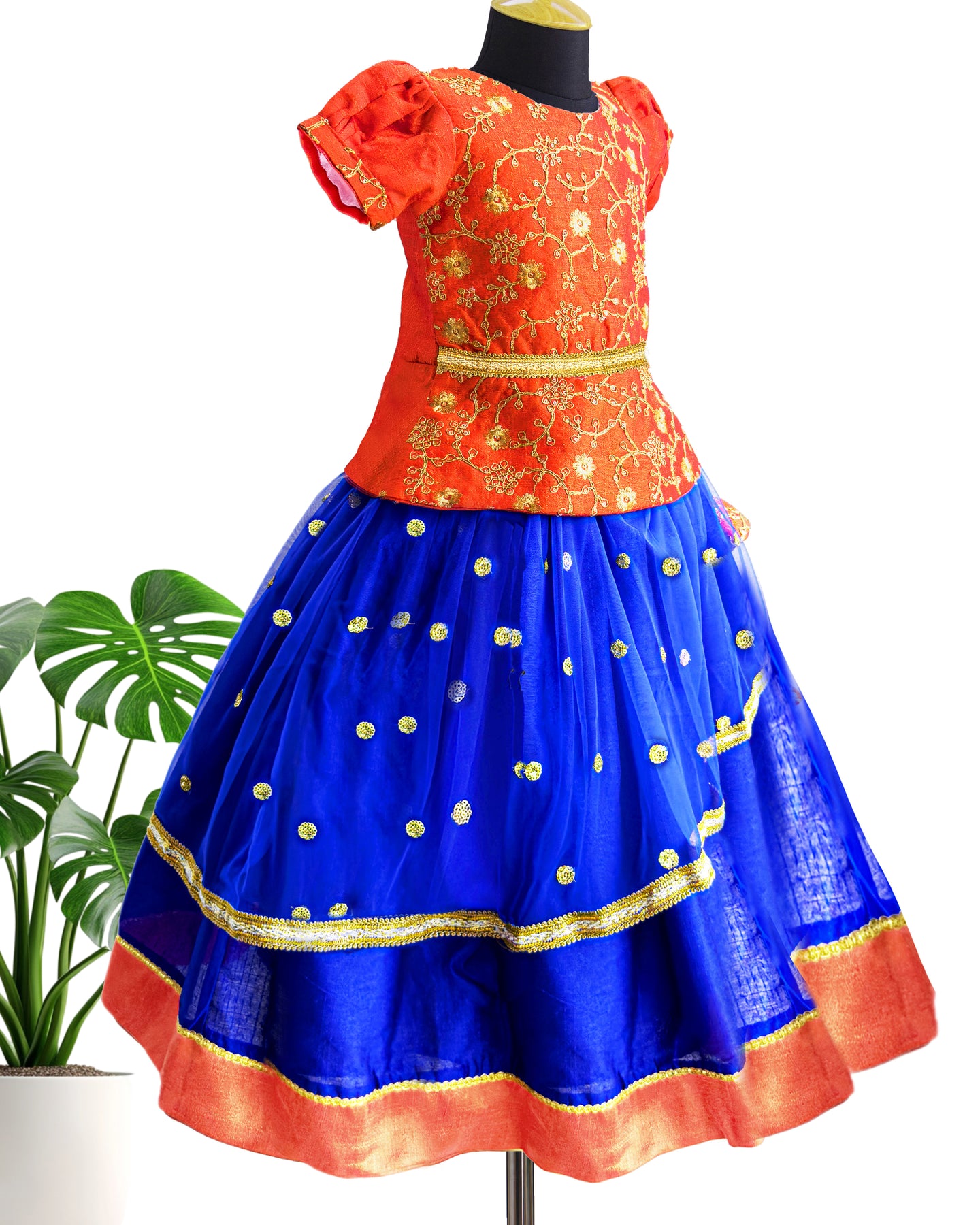 Royal Blue & Orange Combo – A festive and eye-catching color combination that brings out traditional elegance for baby girls and young kids. Sequins Embroidery Work – Intricately designed with hand-applied sequins that add sparkle and charm to the ethnic outfit. Puff Sleeves Choli – Beautifully stitched puff sleeves provide a traditional touch with modern comfort and style. Ready to Wear Set – No stitching required; this fully stitched lehenga choli set is easy to wear and ideal for festive rush. The bold royal blue and orange color combination reflects joyful vibrance and ethnic charm. A perfect blend of comfort, tradition, and beauty, designed to make your little girl shine at every celebration. Celebrate tradition in style with the Stanwells Kids Royal Blue & Orange Lehenga Choli Set, a vibrant and elegant outfit crafted for baby girls and young kids.