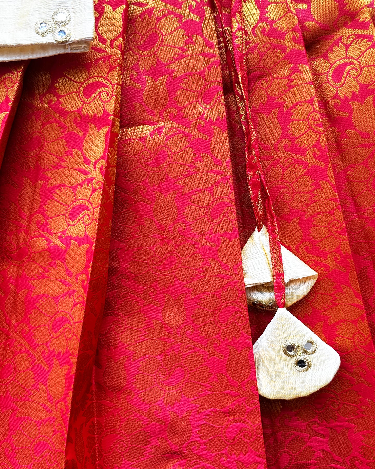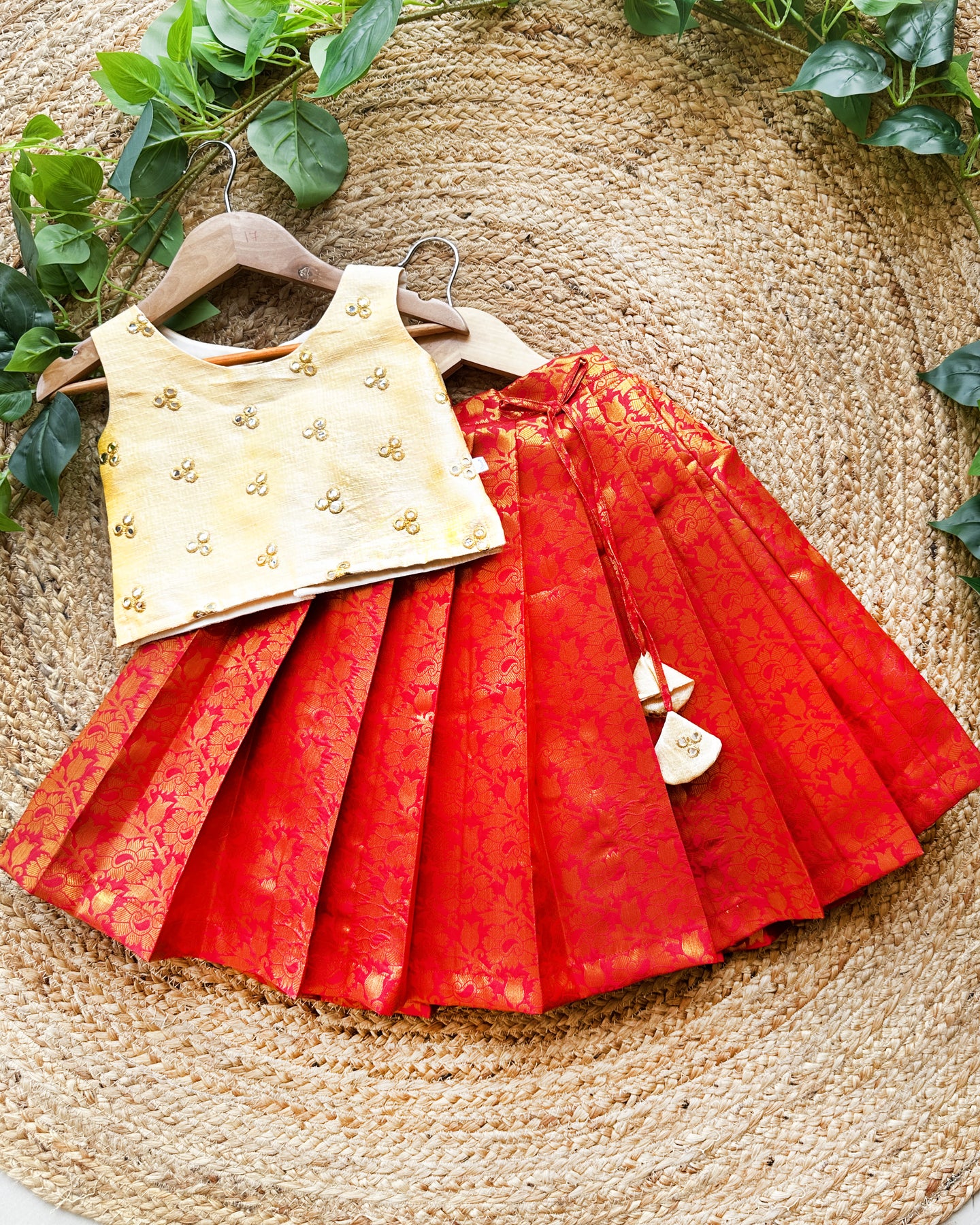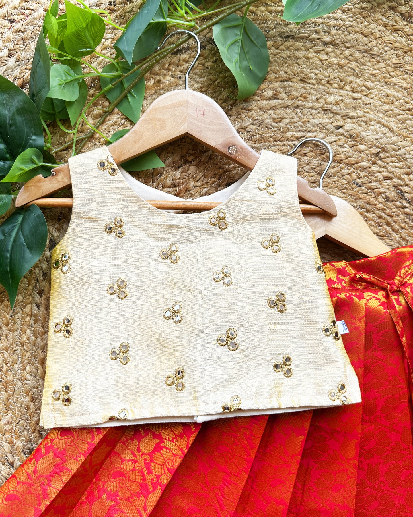 Sandal & Red Lehenga Choli – Mirror Embellished Festive Wear for Baby Girls is made with soft silk fabric. This combination suggests a rich and contrasting colour palette, creating a visually striking and festive look for your little one. Blouse is made with Sandal Shade, and the skirt portion is made with Red Shade pure silk fabric. The skirt portion is designed with Red Banarasi silk fabric in the pleated style. Inner portion of the skirt is covered with white colour soft cotton fabric. Centre potion has a elastic for adjusting the fitness according to the waist size.