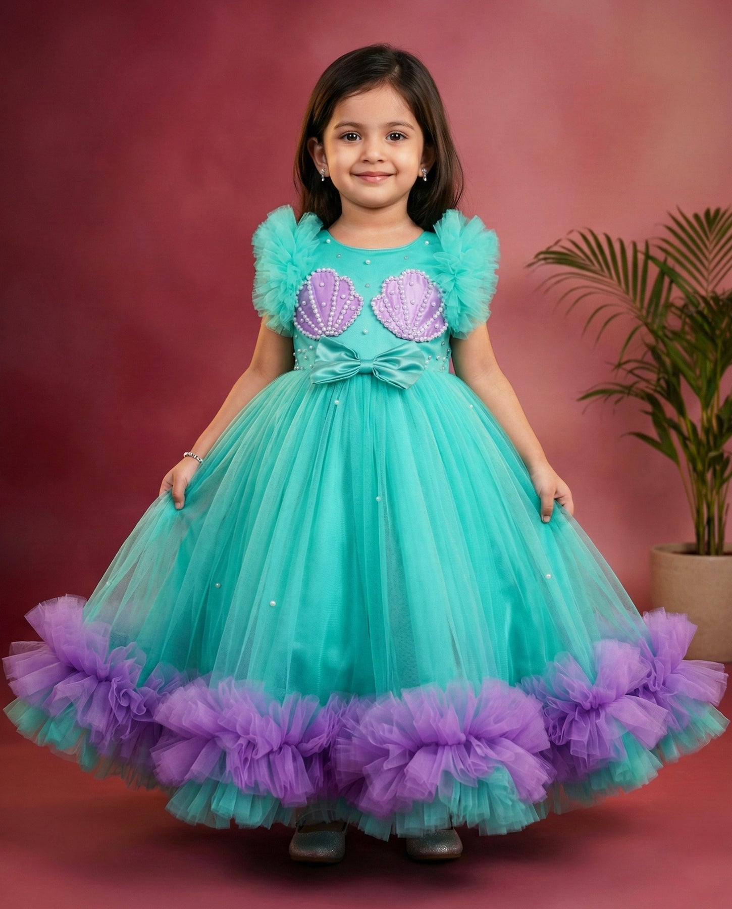 - Sea Green & Lilac Combo Sea Shell Theme Ruffles Birthday Gown is made with soft nylon mono net fabric. The yoke portion of the frock is designed in Sea shells. White colour pearls are used for making the handwork part. The skirt portion of the frock is designed in a flared pattern. The end portion of the frock is beautifully designed with Sea Green and Lilac Colour. A Sea Green Colour heavy ruffles sleeves are attached for a puffy appearance. Back side of the dress has a matching satin tie for adjusting the fitness. Premium matching colour satin is used under net for a glossy feel. Inner portion is covered with white shade high quality soft poplin lining.