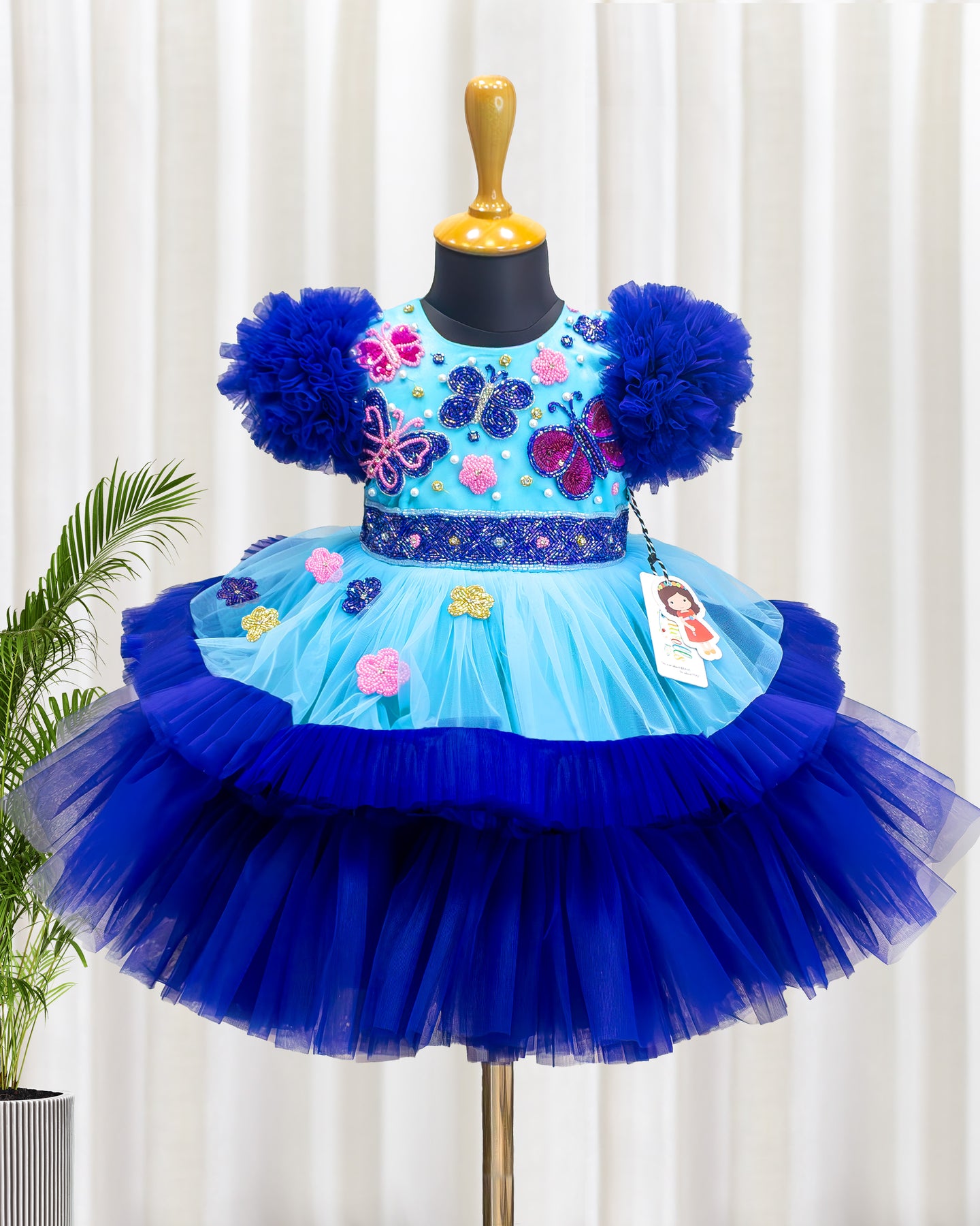 The Sky Blue & Navy Blue combo handwork butterfly theme partywear birthday frock is crafted from soft nylon mono net fabric. The yoke portion of the frock features intricate multicolour butterfly handwork, giving it a rich and elegant appeal. To enhance the premium look, a matching navy-blue hand worked belt is attached. Silver, navy blue, and dark pink cut beads, along with white clutch stones, beads, and purple and pink sequins, are used to create the detailed handwork. The skirt portion of the frock is designed in a beautifully flared pattern. The hemline is elegantly finished with navy blue long ruffles and delicate pleats. Heavy navy-blue ruffle sleeves are added to create a soft, puffy appearance. The back portion of the frock includes a matching silk tie for an adjustable and comfortable fit. Premium matching-colour satin is layered under the net to provide a glossy finish, while the inner portion is fully lined with high-quality white soft poplin fabric for added comfort.
