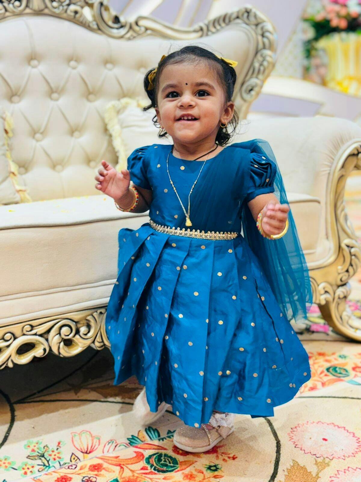 Teal Blue Silk Butti Frock – Ethnic Party & Festive Dress for Baby Girls is made Butti silk fabric. The yoke portion of the frock is designed in a semi dhavani pattern. A saree type pleats is given on one side of the frock. The centre potion has a belt which looks so elegant. The skirt portion of the frock is designed as normal pleated pattern. Back portion of the frock has a matching silk tie for adjusting the fitness. Premium matching colour satin is used for net for glossy feel. Inner portion is covered with white shade high quality soft poplin lining.