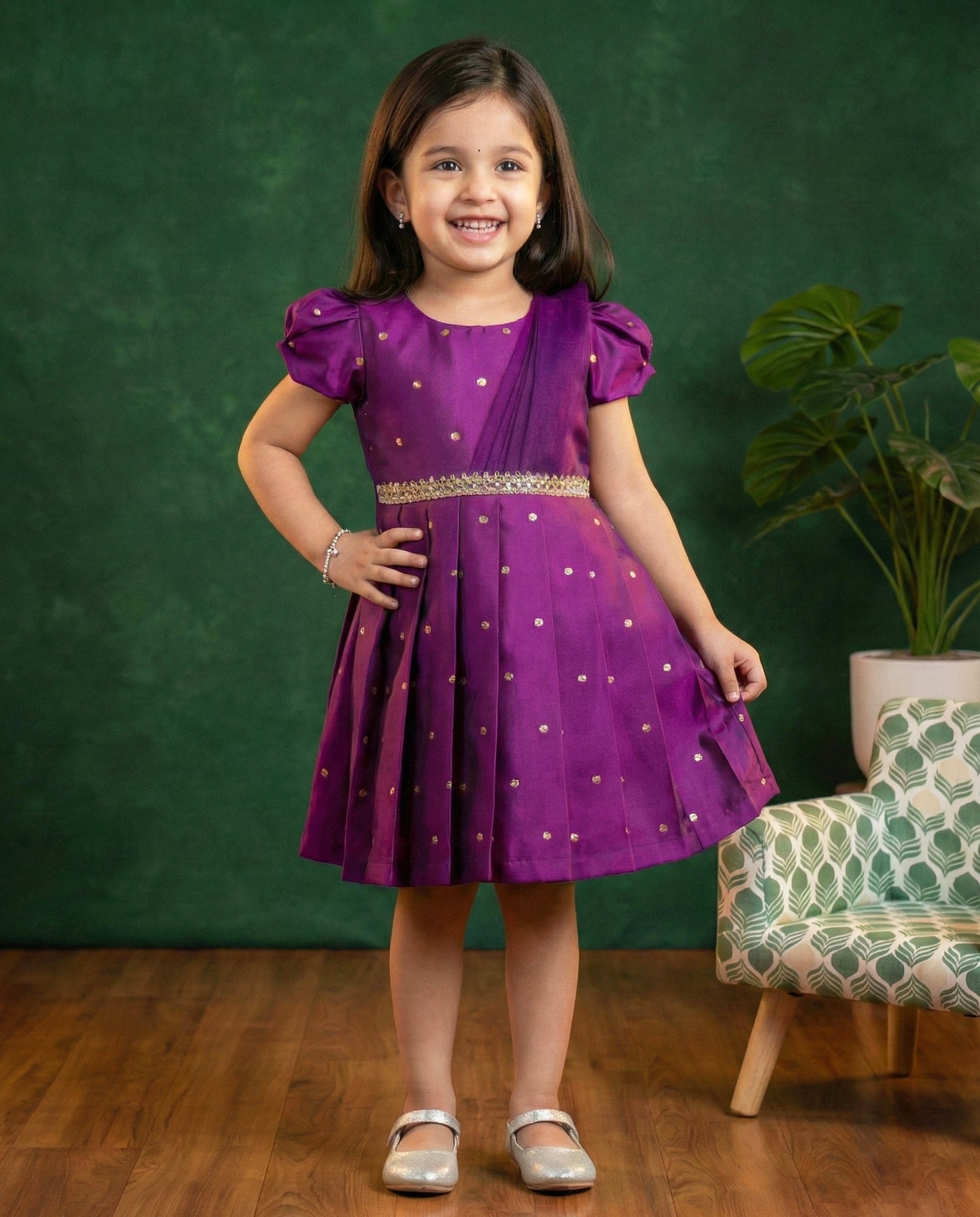 Violet Shade Silk Butti Frock – Ethnic Party & Festive Dress for Baby Girls is made Butti silk fabric. The yoke portion of the frock is designed in a semi dhavani pattern. A saree type pleats is given on one side of the frock. The centre potion has a belt which looks so elegant. The skirt portion of the frock is designed as normal pleated pattern. Back portion of the frock has a matching silk tie for adjusting the fitness. Premium matching colour satin is used for net for glossy feel. Inner portion is covered with white shade high quality soft poplin lining.